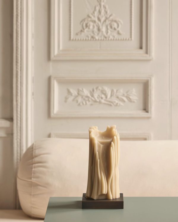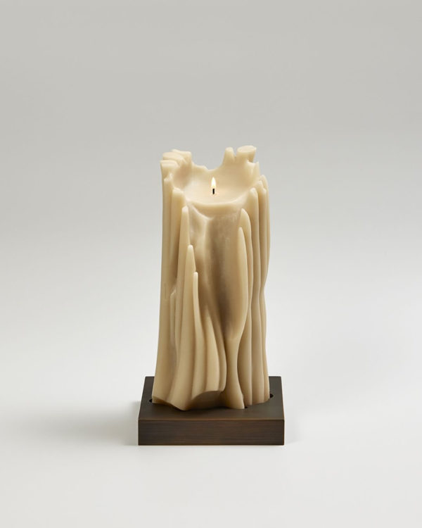 Crafted in a semi-vegetal wax, the stone-colored totem candle is set atop a hand-painted brass stand with a bronze patina. Complete with a Certificate of Authenticity, this piece evokes natural beauty in every line, inviting warmth and organic elegance into any space.