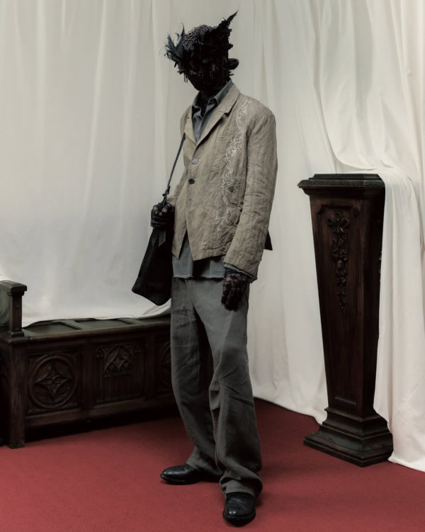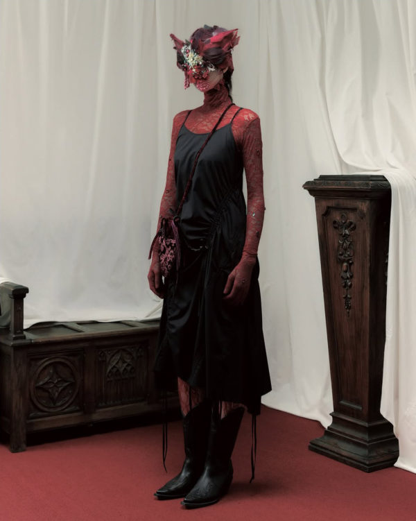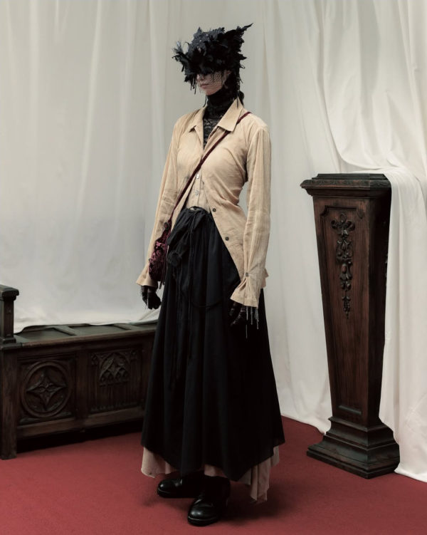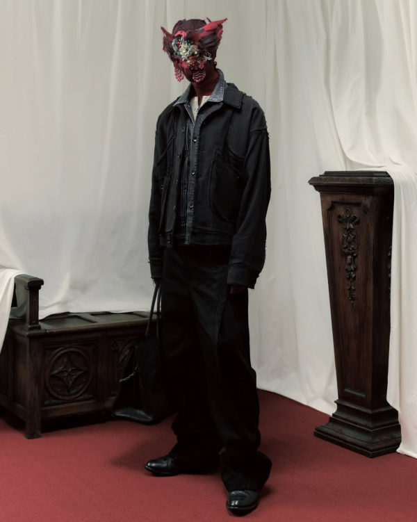 The masks, ever-present, evolve too. Beautifully crafted from black and red feathers, they function not only as aesthetic markers but also as conceptual statements: that fashion can still exist outside the self, beyond the screen, as something felt rather than performed.