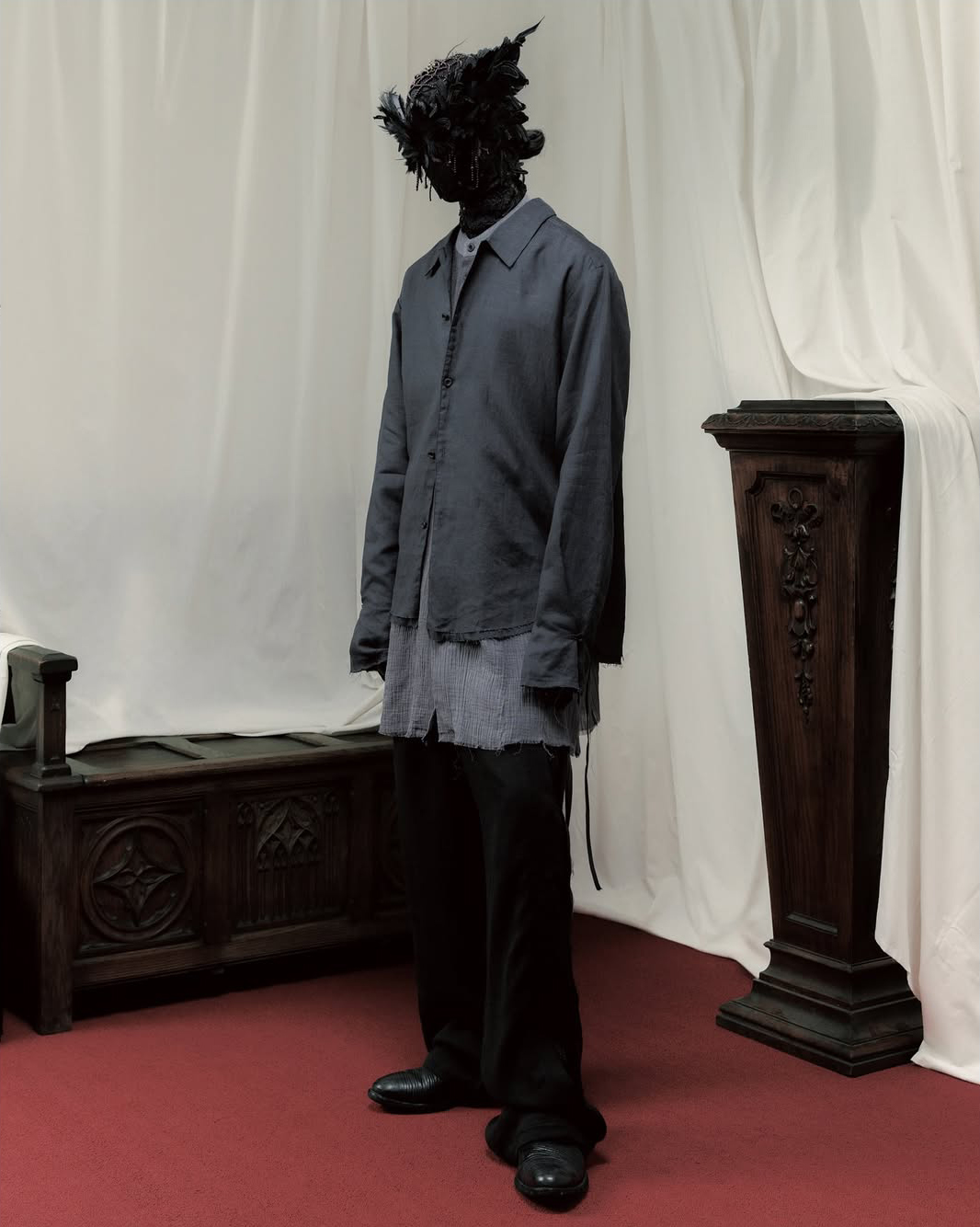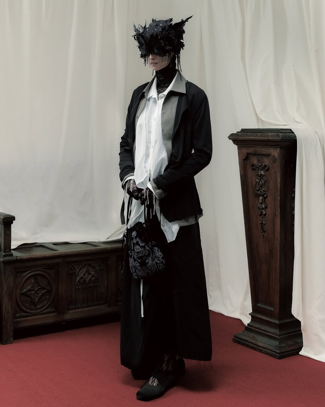 Based in Taiwan and steadily shaping a distinct space within the global avant-garde scene, Professor.E approaches Spring/Summer not with obvious seasonal tropes, but with a controlled release. The silhouettes feel looser, more elongated. Fabrics are lighter but still grounded, natural fibers, textured weaves, soft volumes that respond to the body and the climate without compromising on intention.