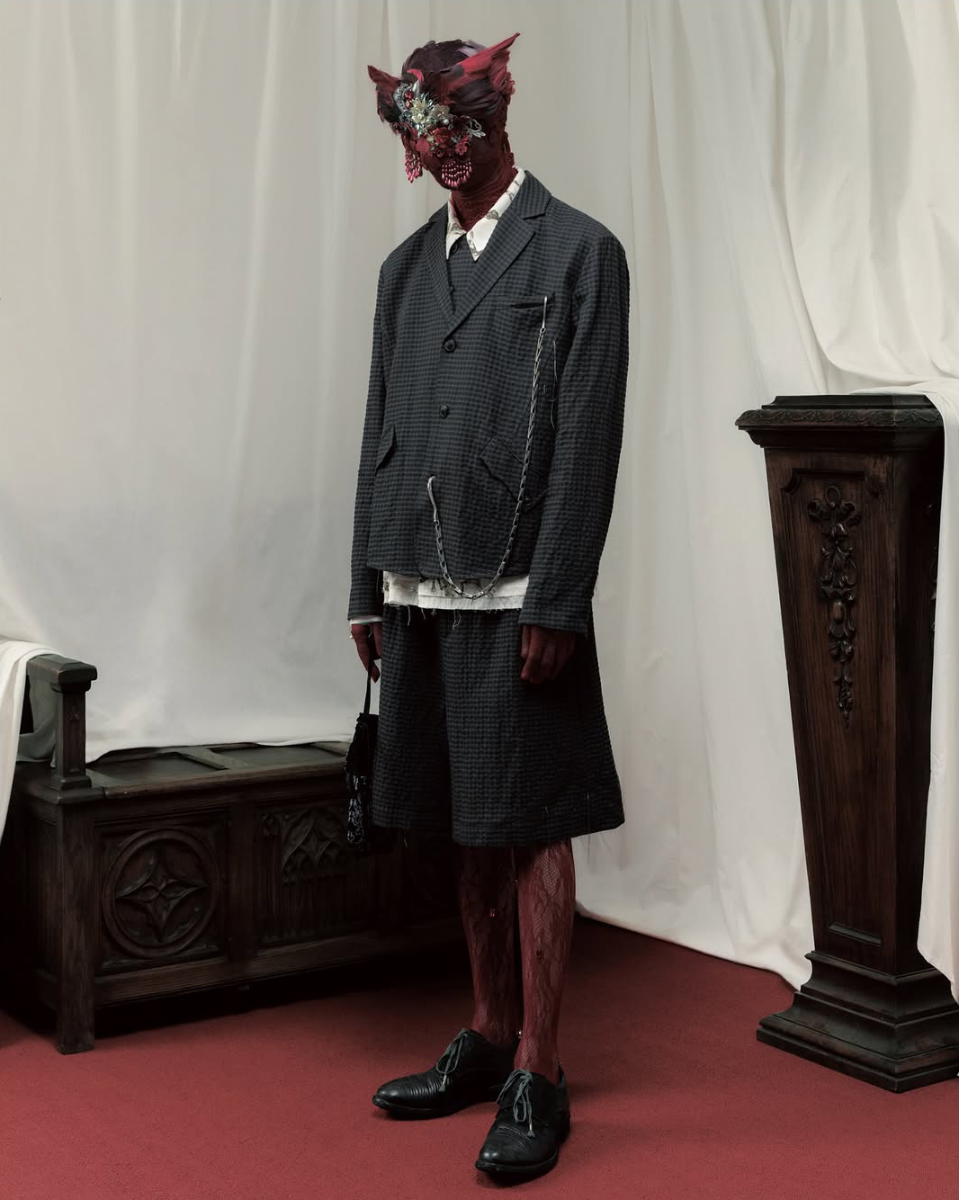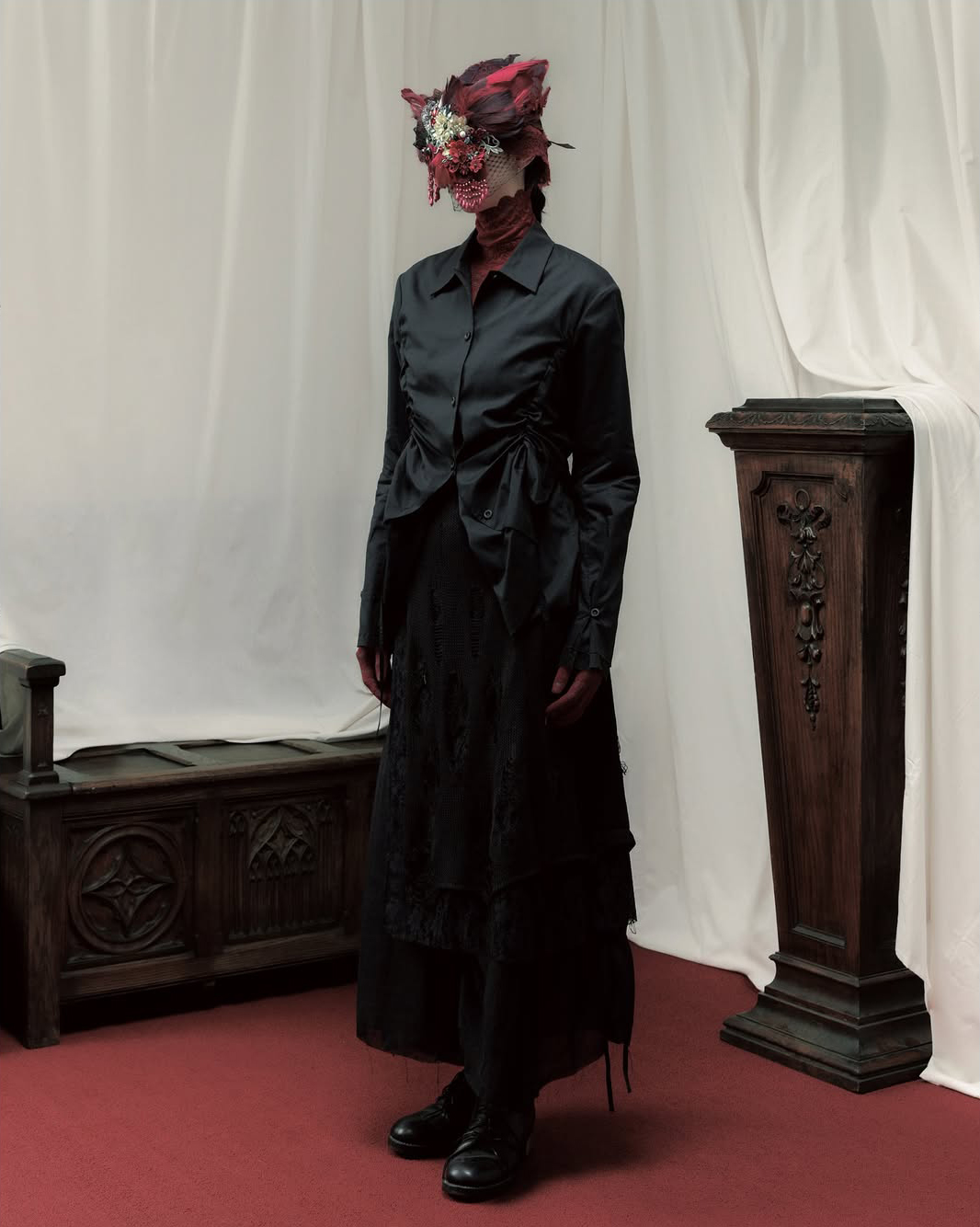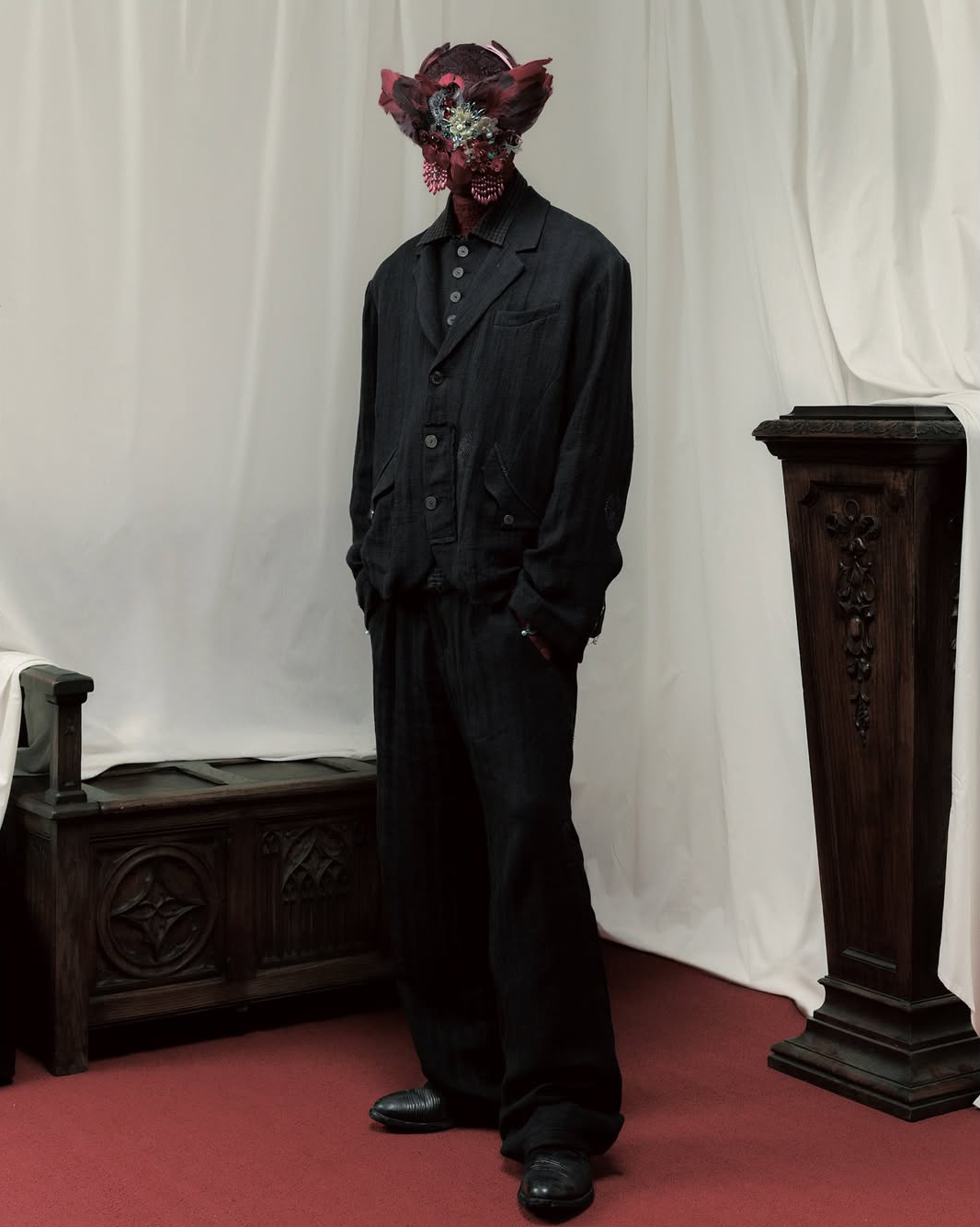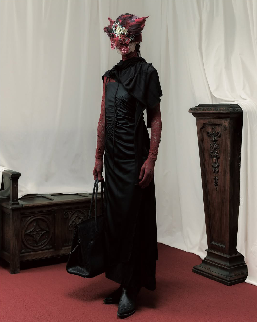 The masks, ever-present, evolve too. Beautifully crafted from black and red feathers, they function not only as aesthetic markers but also as conceptual statements: that fashion can still exist outside the self, beyond the screen, as something felt rather than performed.