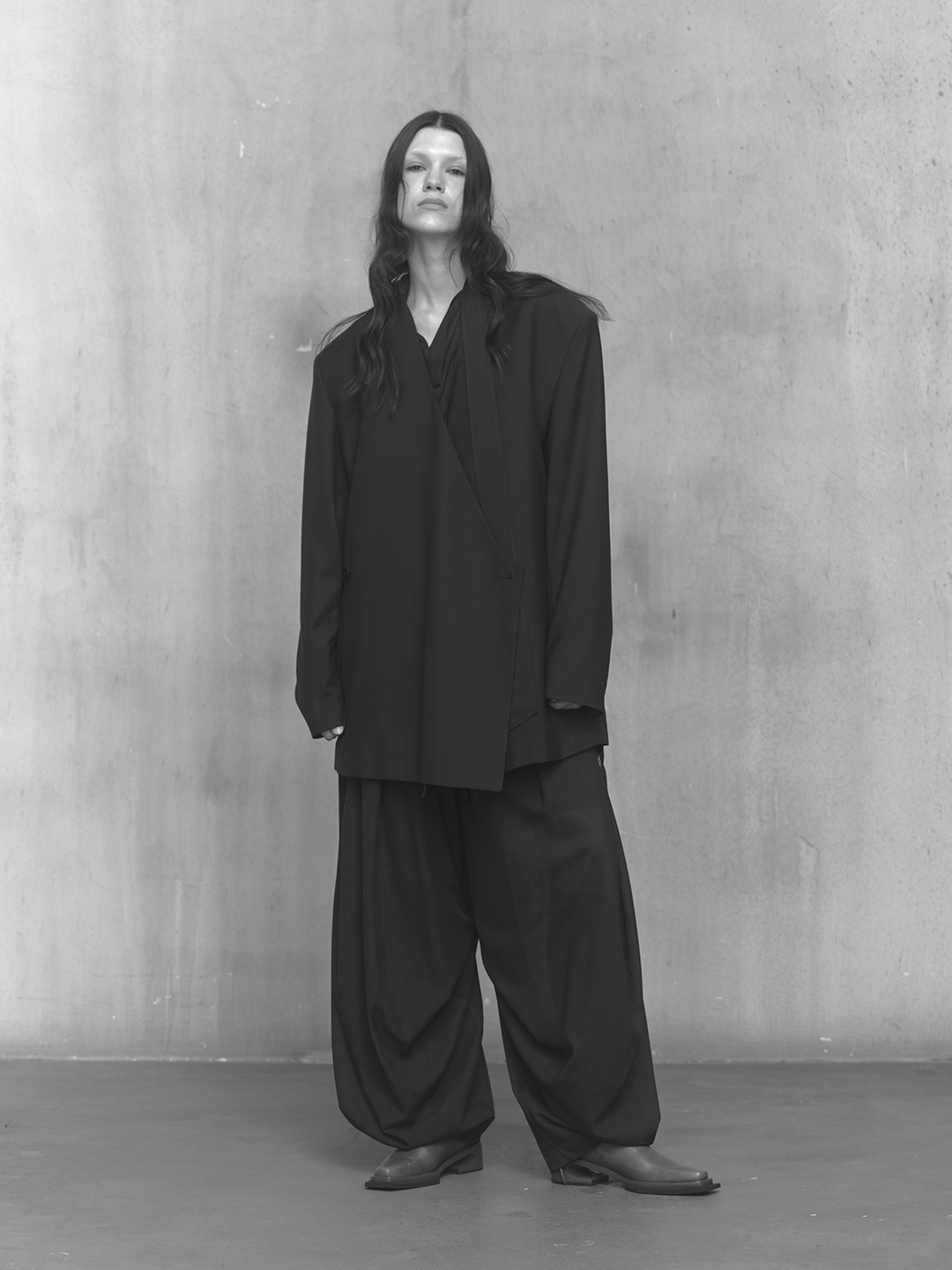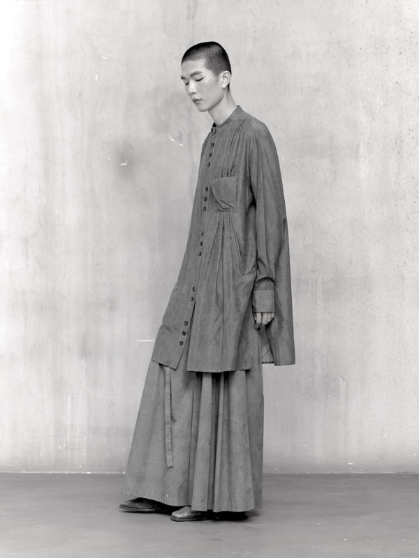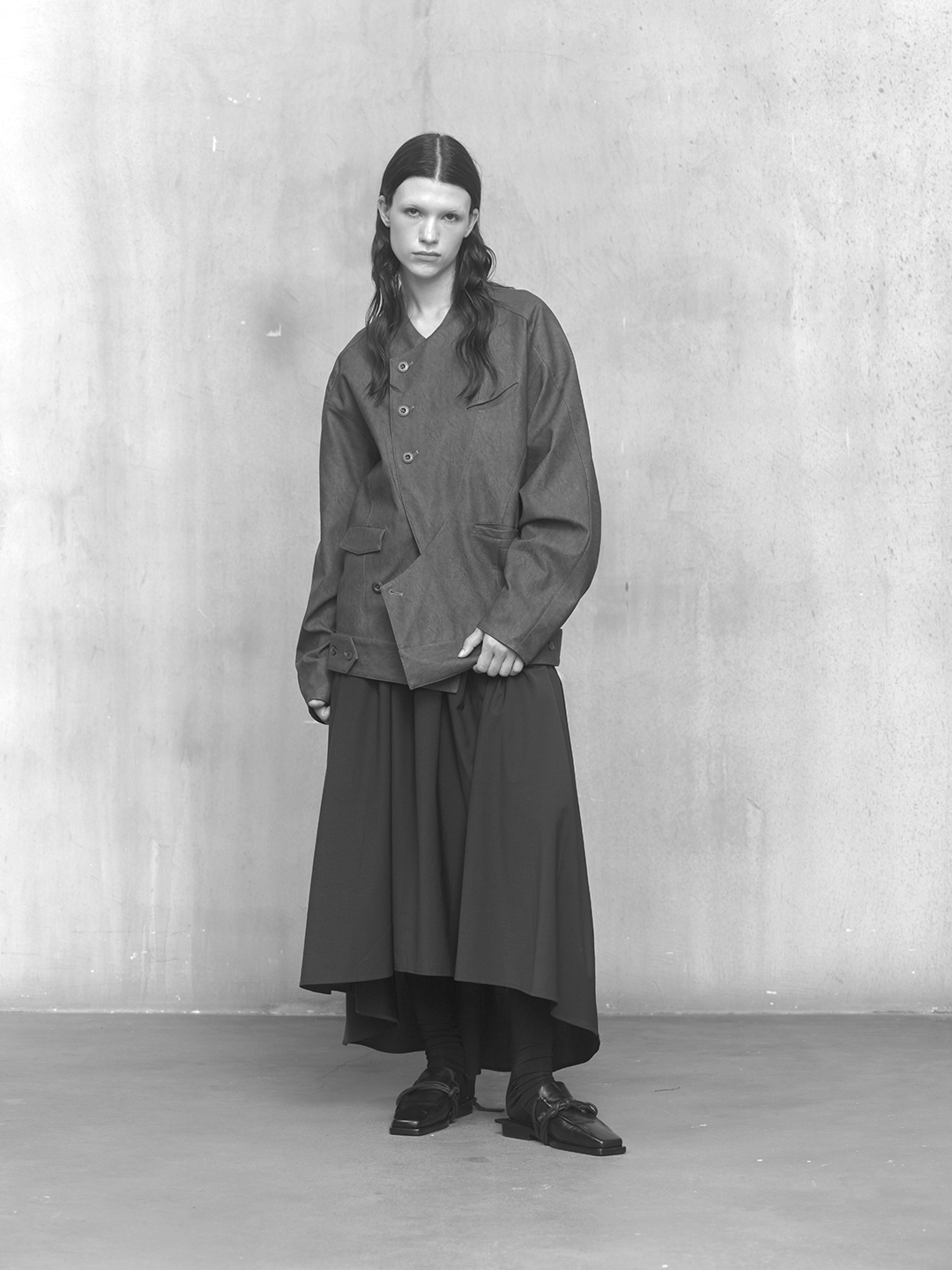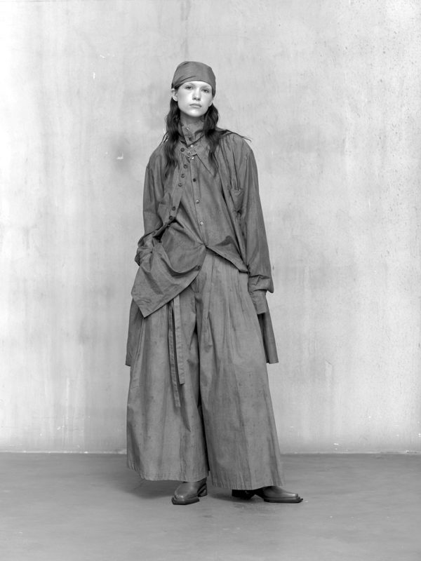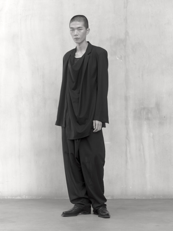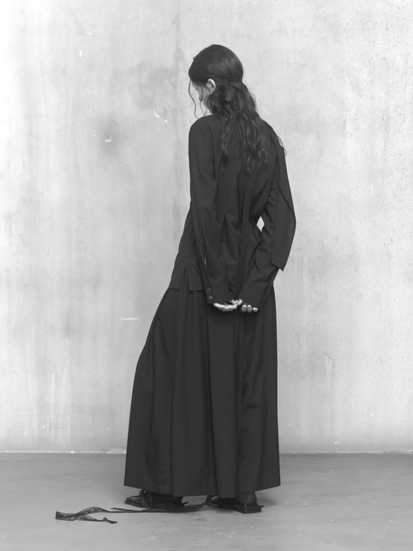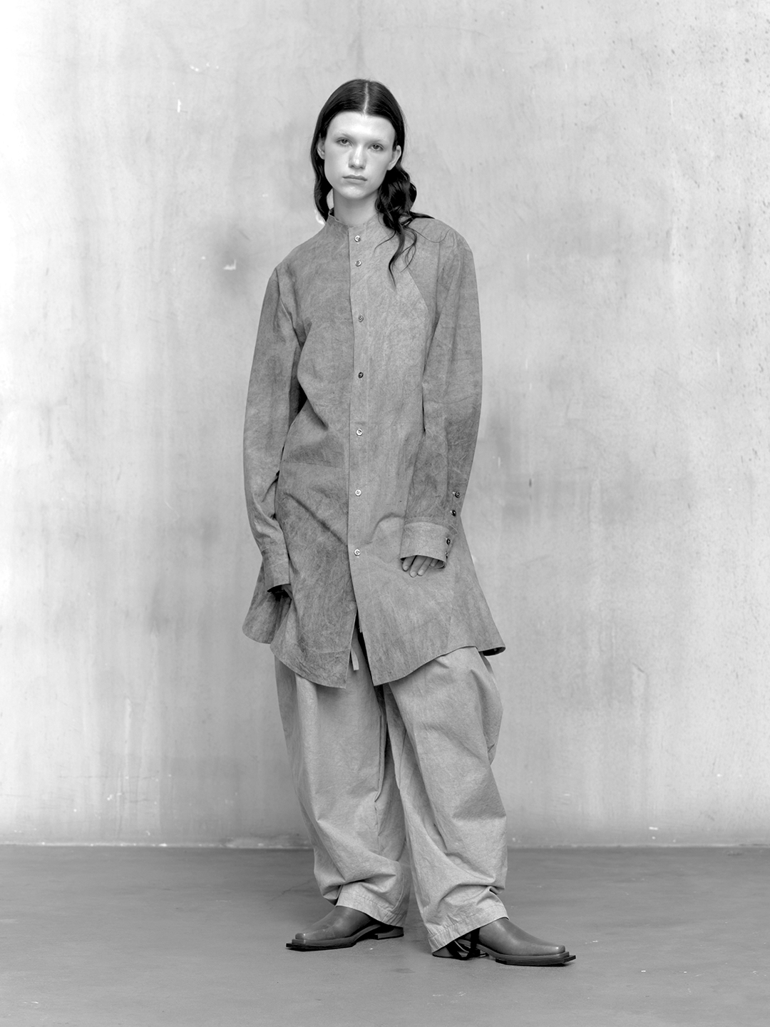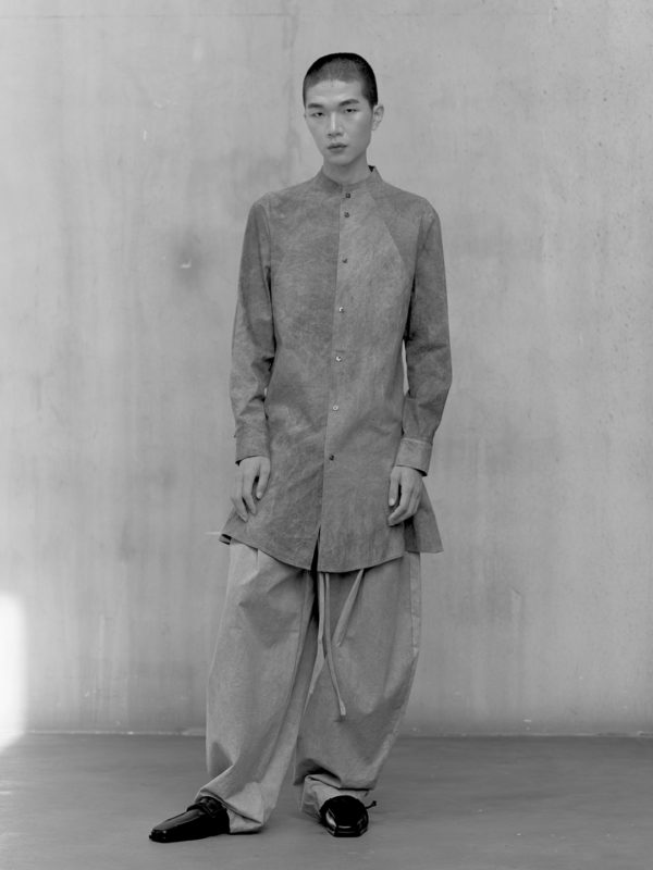Across the collection, tailoring loosens into volume and drape. Jackets sit slightly displaced from the body, trousers pool and fold at the ground, and long shirts extend into tunic-like proportions. Asymmetry appears through layered panels, offset closures, and irregular hems, allowing garments to shift as the wearer moves. The palette remains restrained, emphasizing texture, weight, and construction over contrast. These silhouettes reinforce the idea of the garment as a site of passage, shaped through movement and layering.