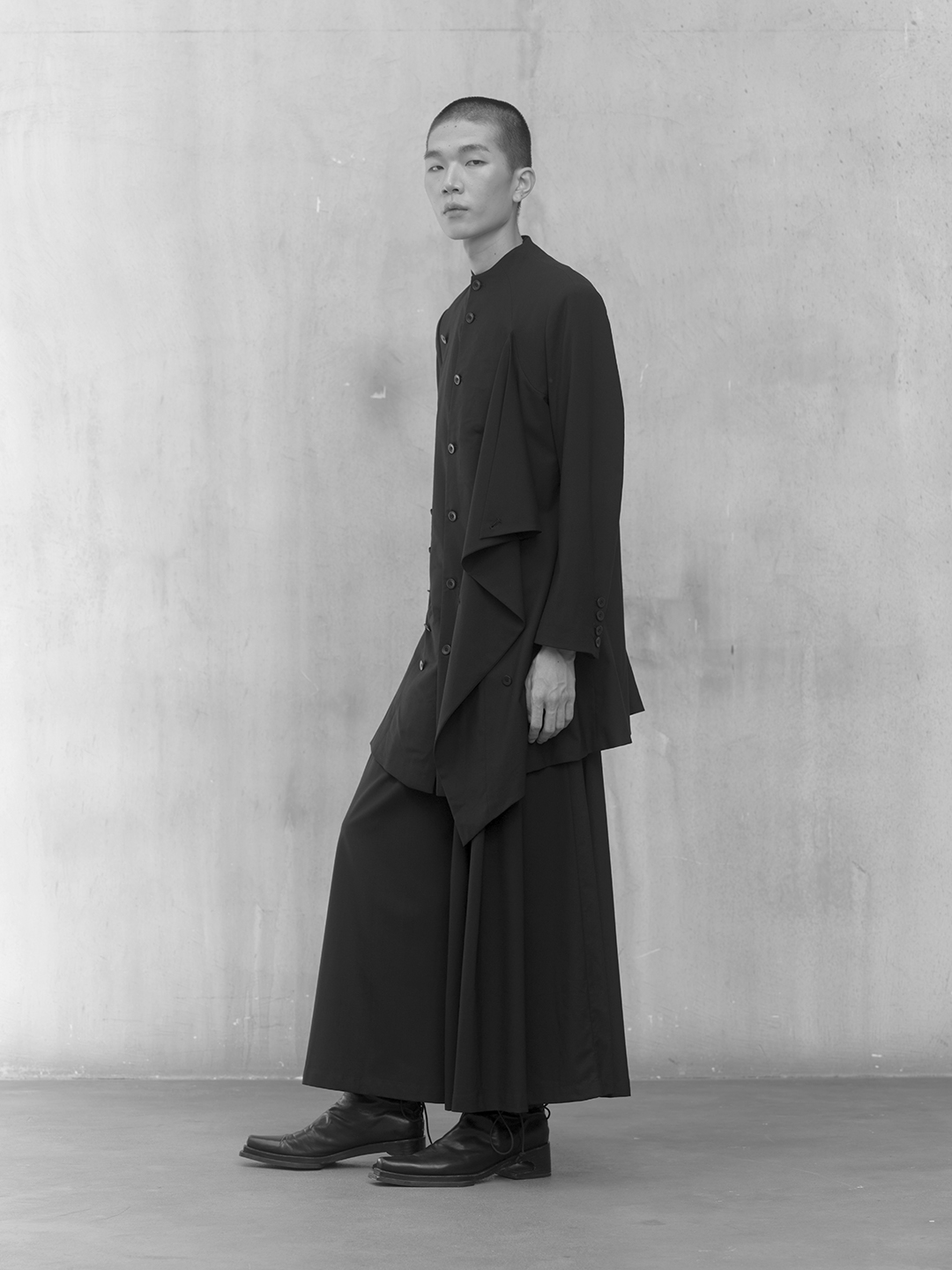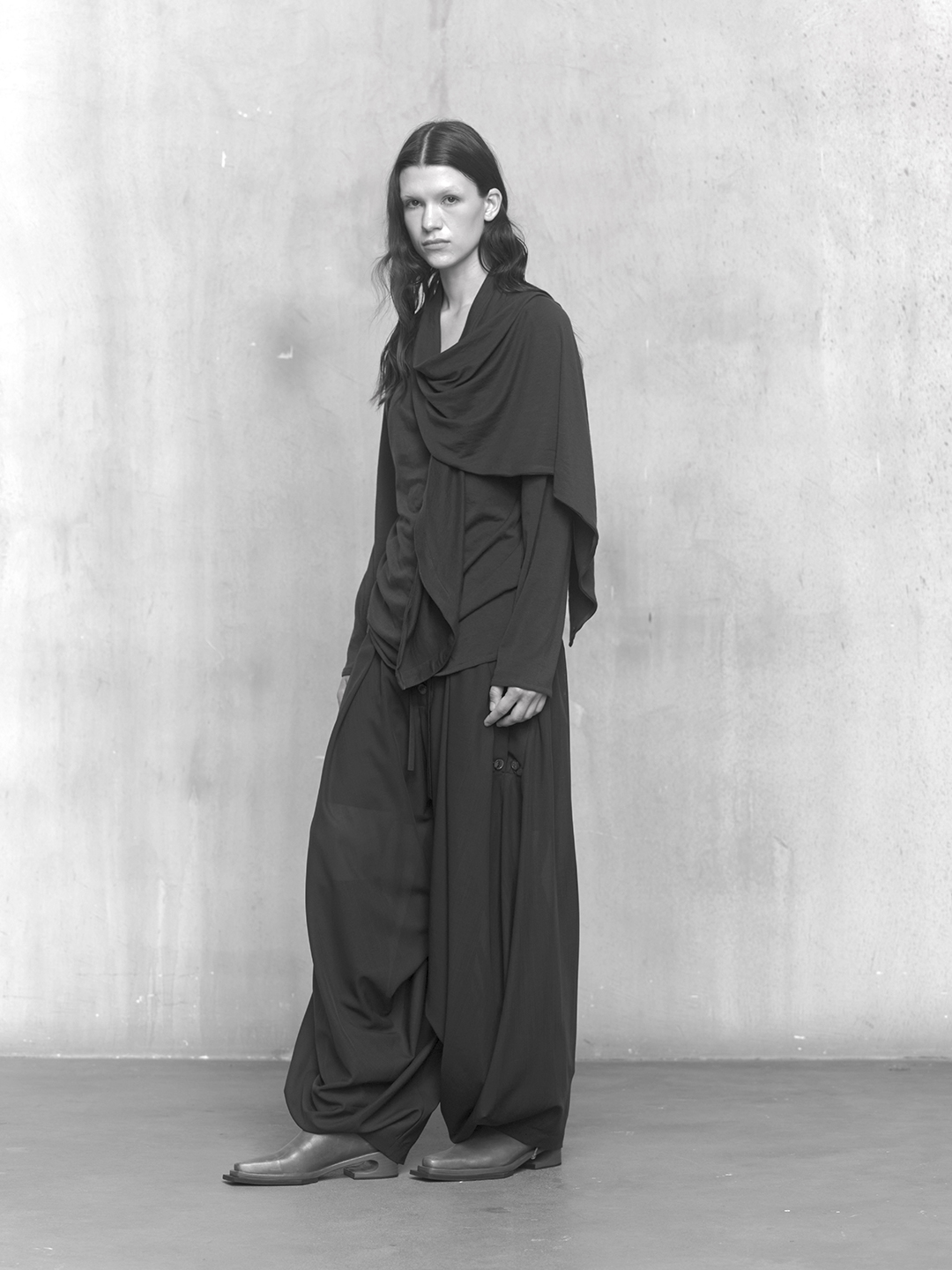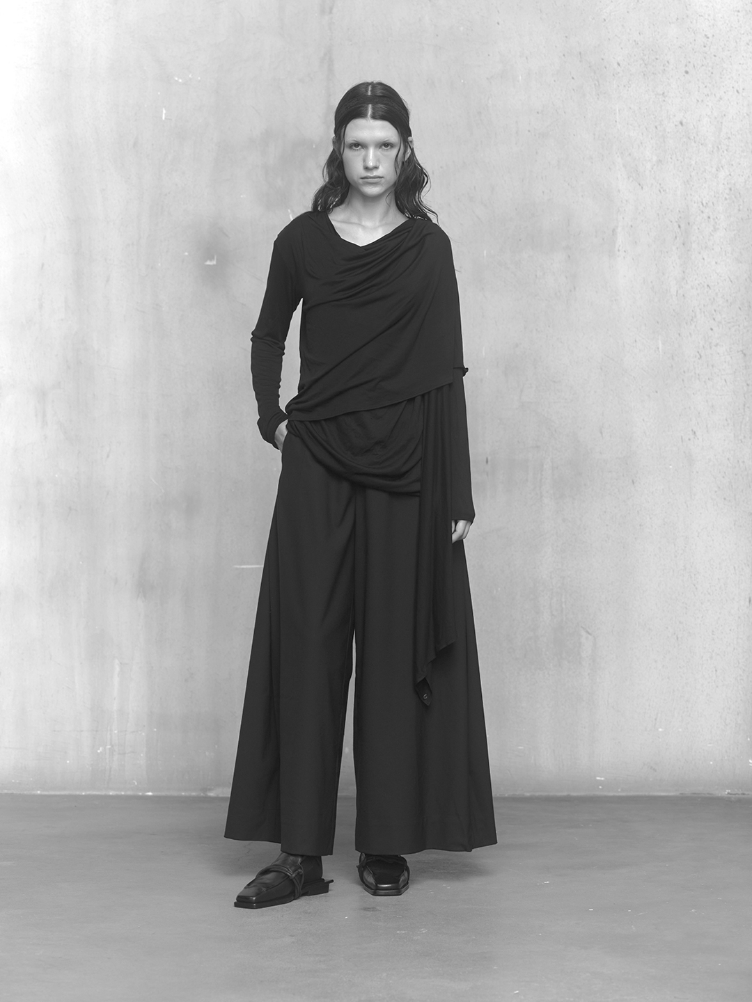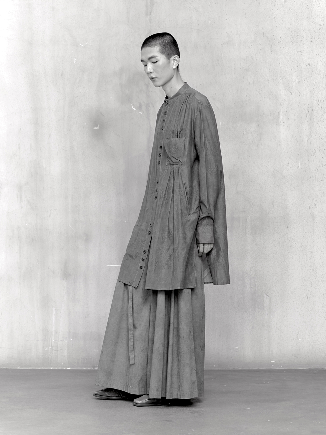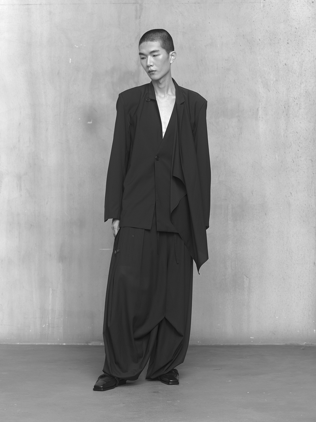 Across the collection, tailoring loosens into volume and drape. Jackets sit slightly displaced from the body, trousers pool and fold at the ground, and long shirts extend into tunic-like proportions. Asymmetry appears through layered panels, offset closures, and irregular hems, allowing garments to shift as the wearer moves. The palette remains restrained, emphasizing texture, weight, and construction over contrast. These silhouettes reinforce the idea of the garment as a site of passage, shaped through movement and layering.