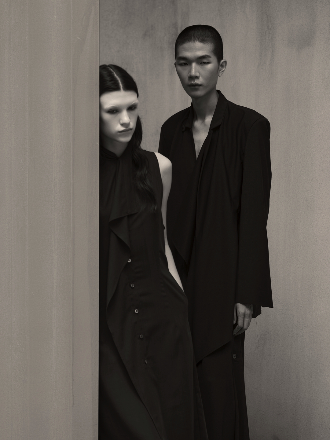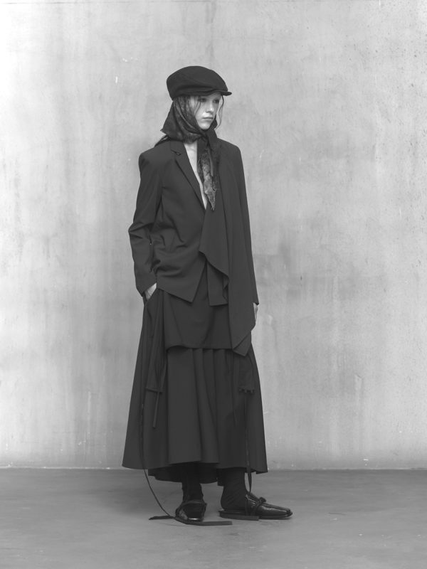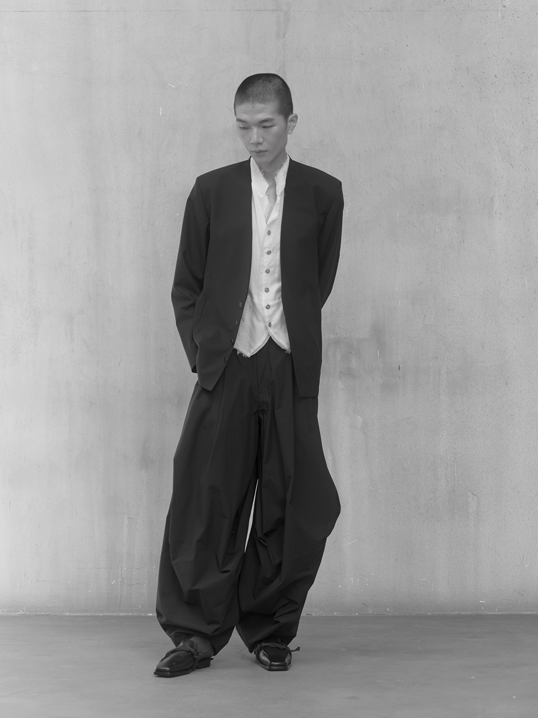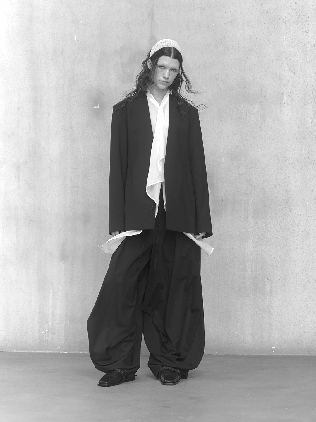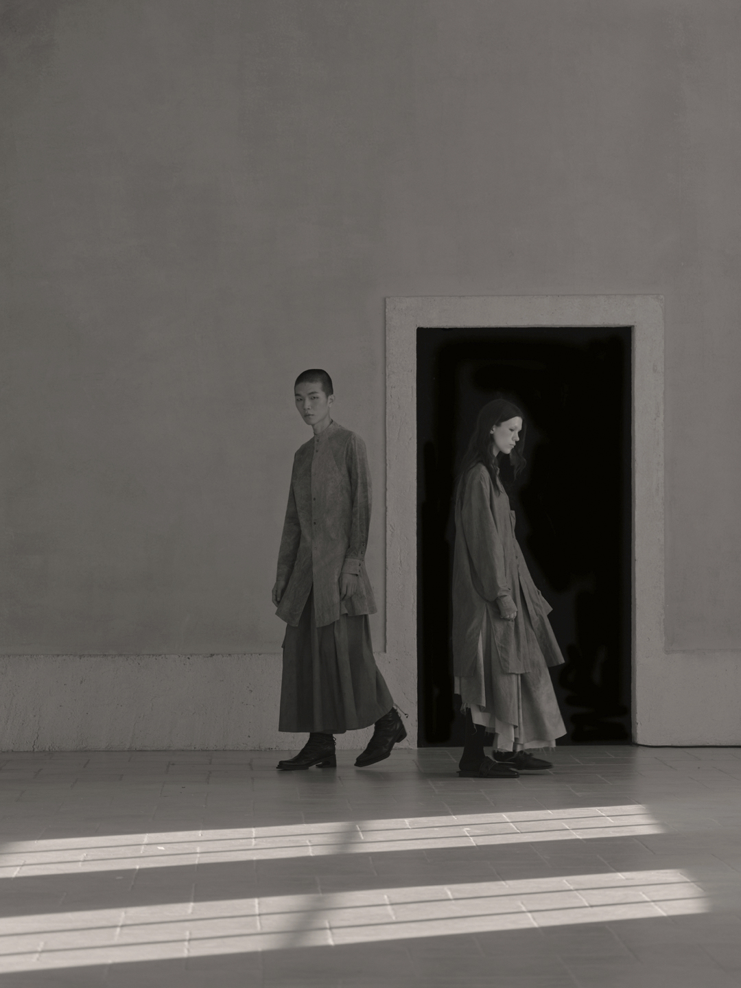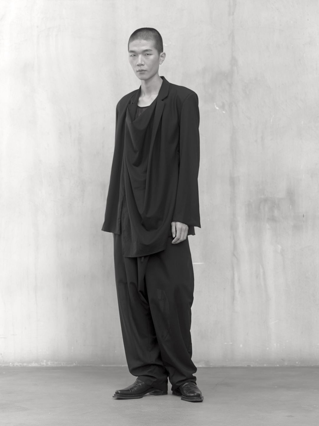 Across the collection, tailoring loosens into volume and drape. Jackets sit slightly displaced from the body, trousers pool and fold at the ground, and long shirts extend into tunic-like proportions. Asymmetry appears through layered panels, offset closures, and irregular hems, allowing garments to shift as the wearer moves. The palette remains restrained, emphasizing texture, weight, and construction over contrast. These silhouettes reinforce the idea of the garment as a site of passage, shaped through movement and layering.