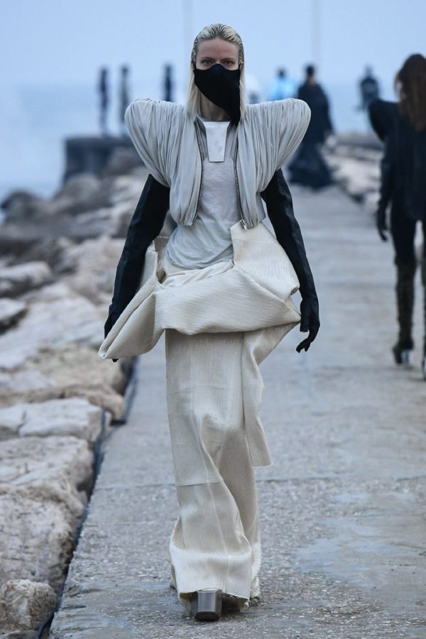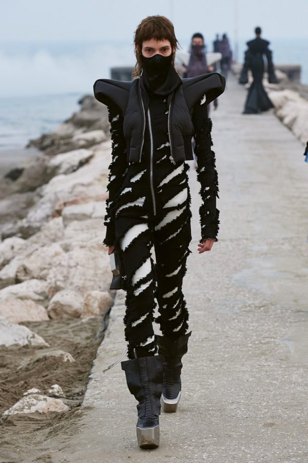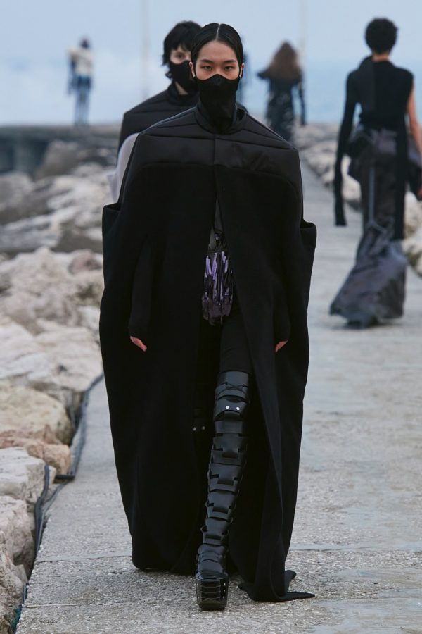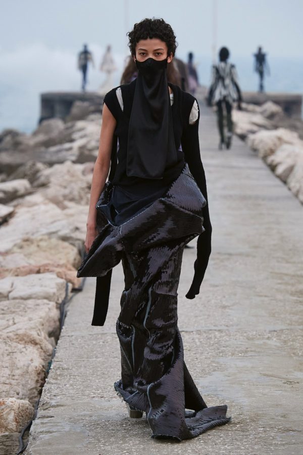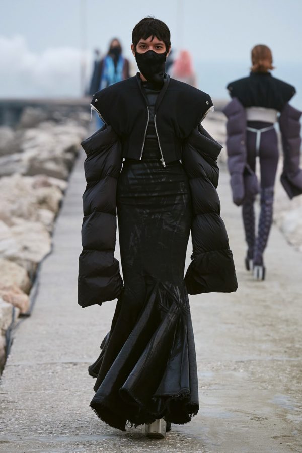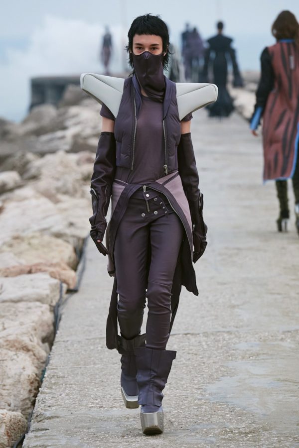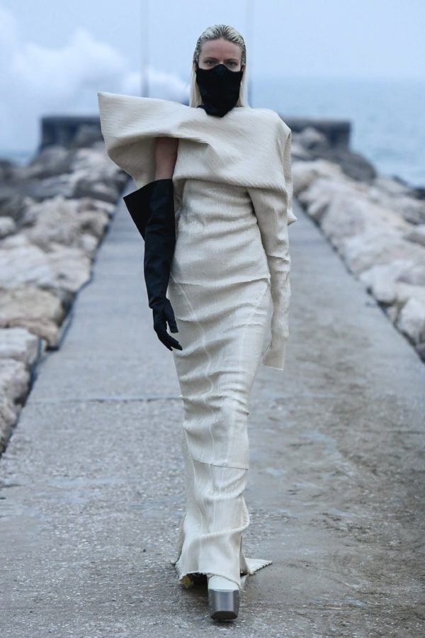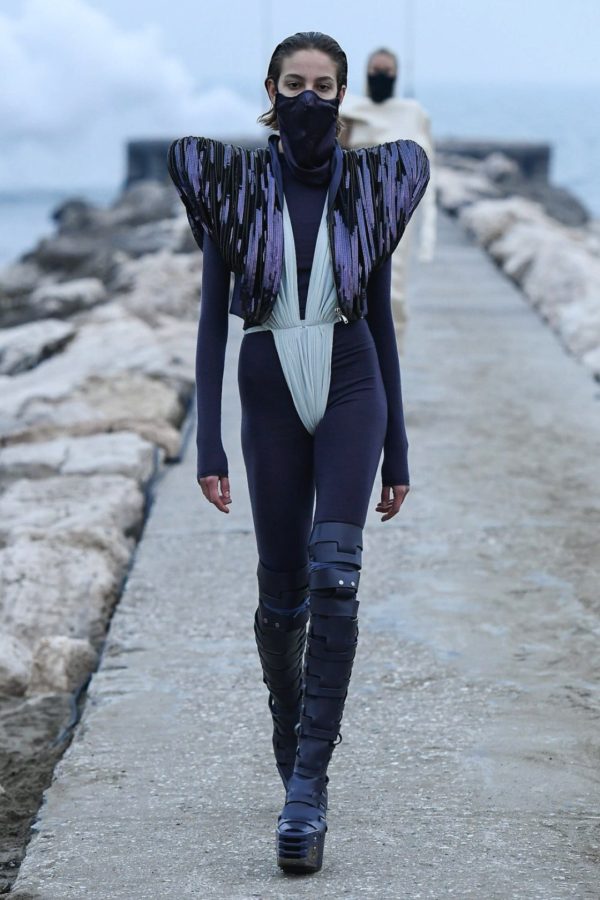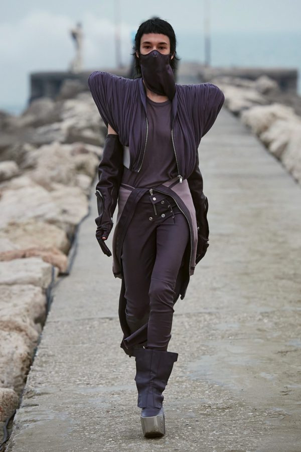 These are topped by power shoulder capes that turn the body into architectural bulldozers, or power shoulder bombers mocking male aggression and conservatism careening off the rails that was the focus of my men’s show in January — coinciding with the shocking events in Washington. These shoulders are a response to fear and anxiety; defiance in the face of threat. I have shown masks with these pandemic shows not because my masks are guaranteed protection, but because they are a vote for responsibility and consideration and an acknowledgement of our immediate collective experience.