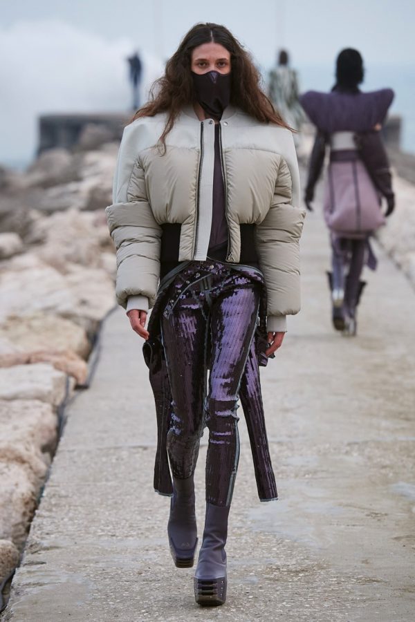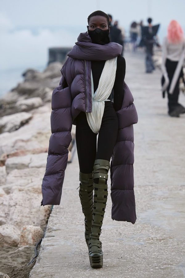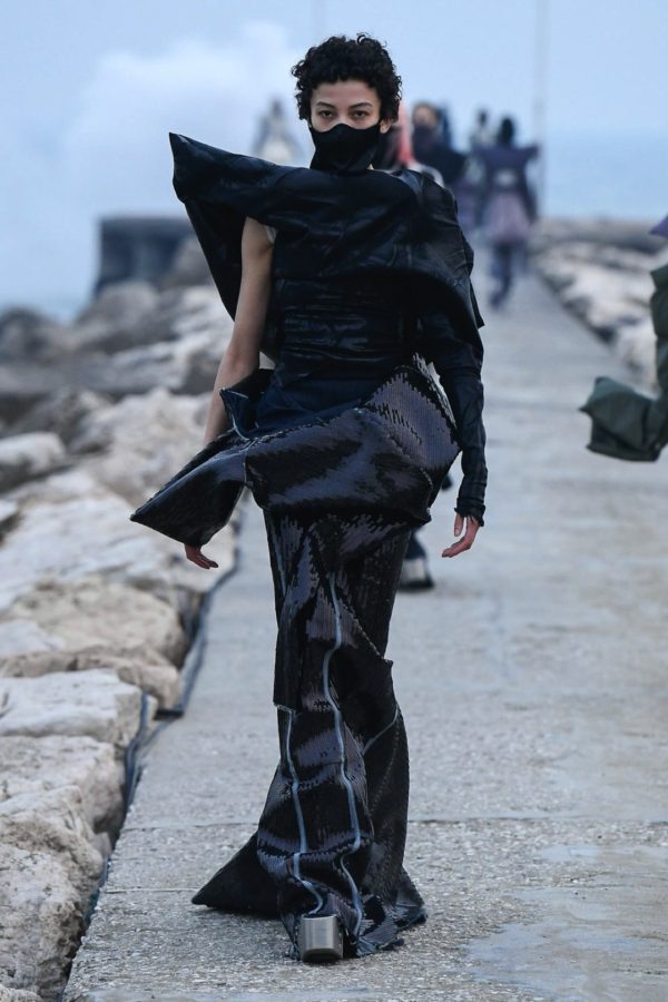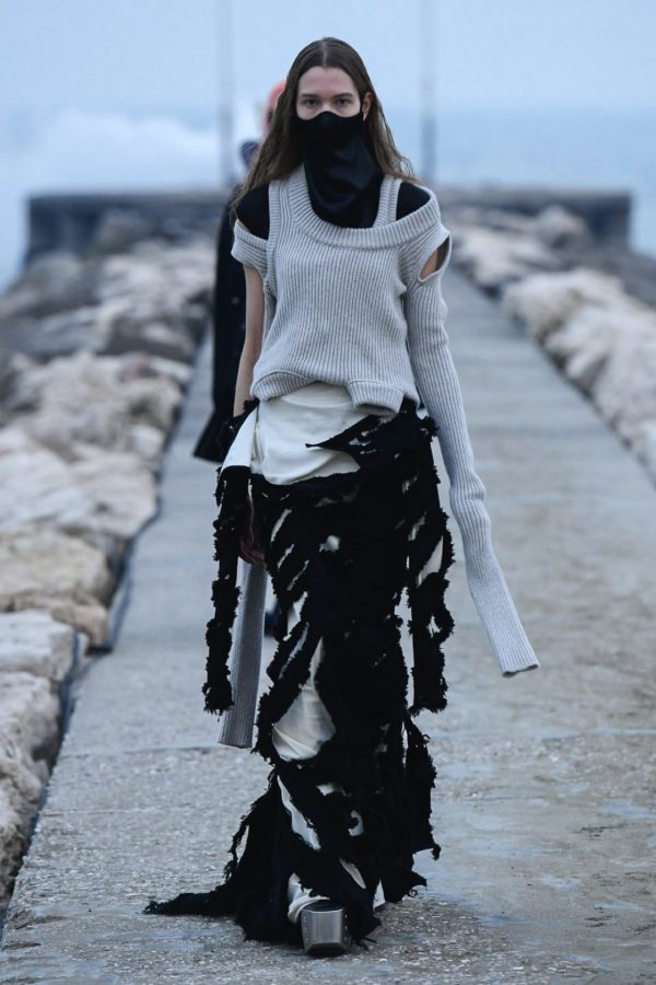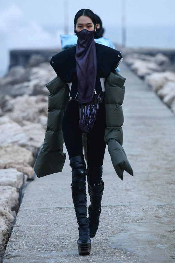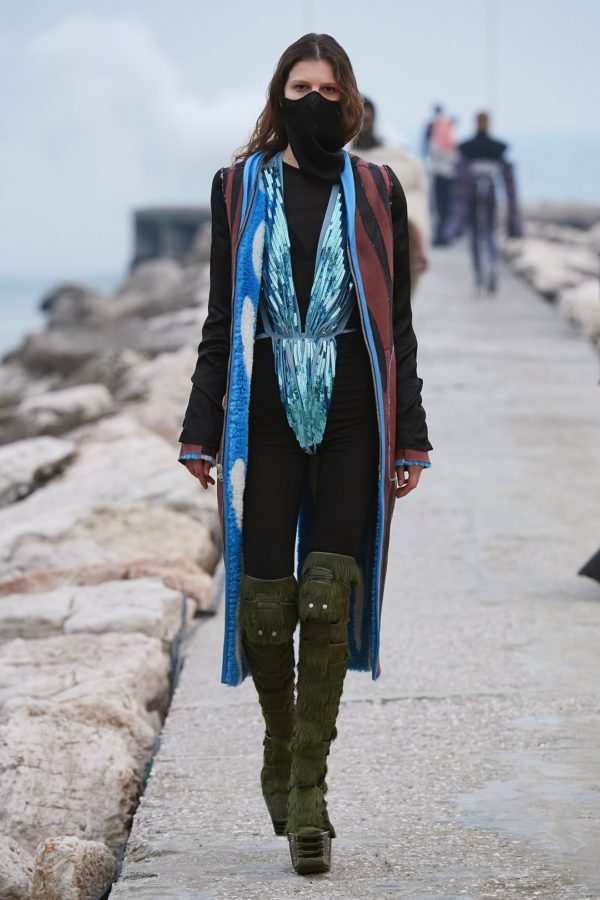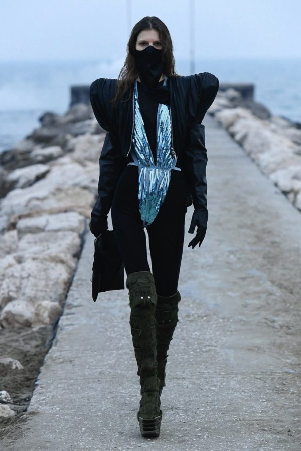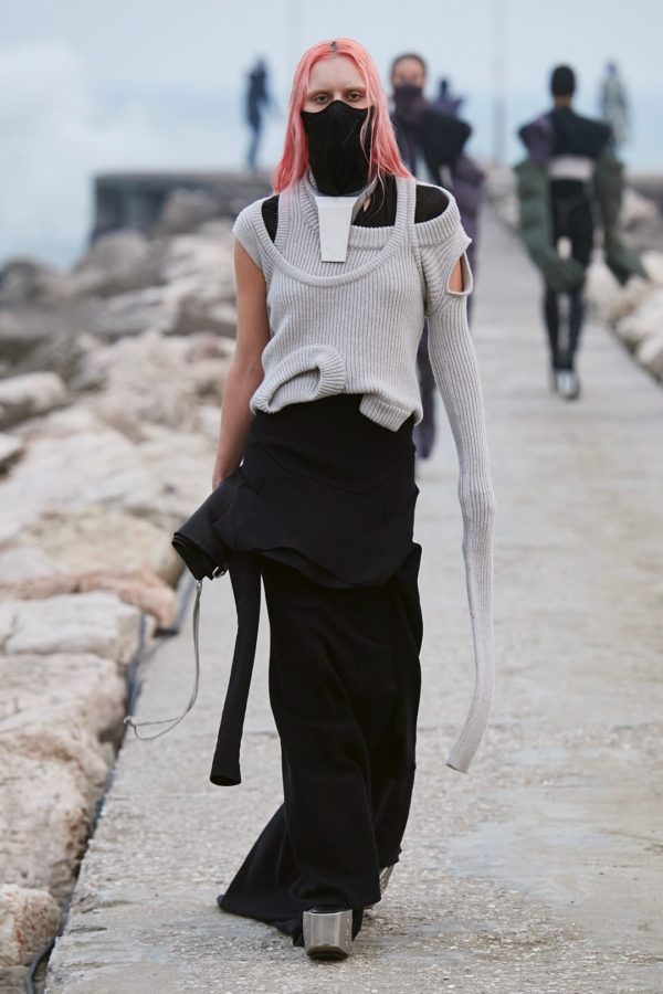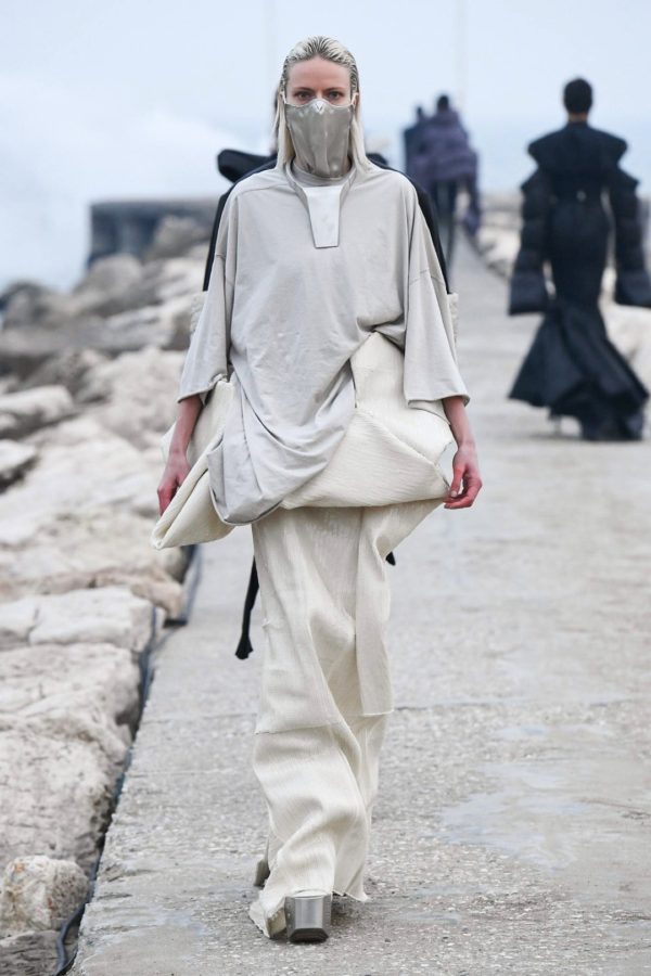 These are topped by power shoulder capes that turn the body into architectural bulldozers, or power shoulder bombers mocking male aggression and conservatism careening off the rails that was the focus of my men’s show in January — coinciding with the shocking events in Washington. These shoulders are a response to fear and anxiety; defiance in the face of threat. I have shown masks with these pandemic shows not because my masks are guaranteed protection, but because they are a vote for responsibility and consideration and an acknowledgement of our immediate collective experience.