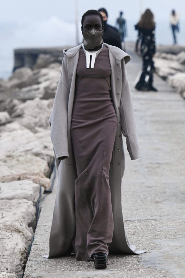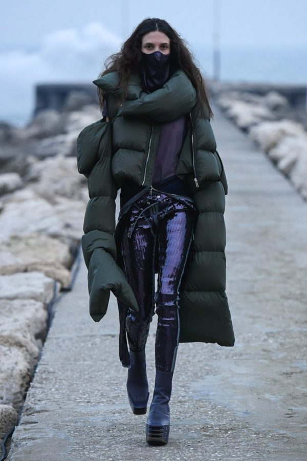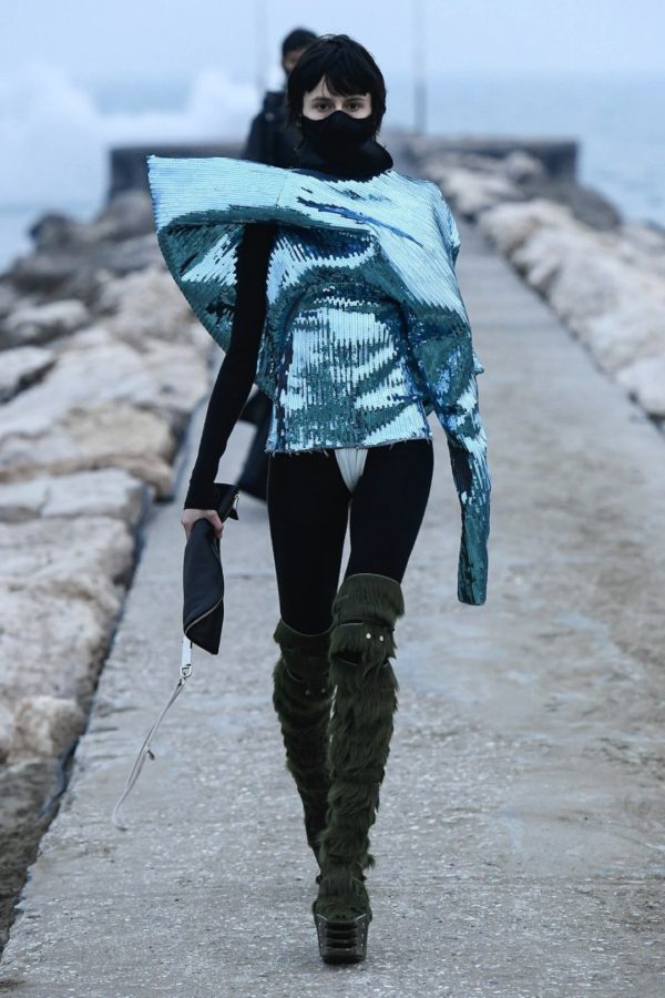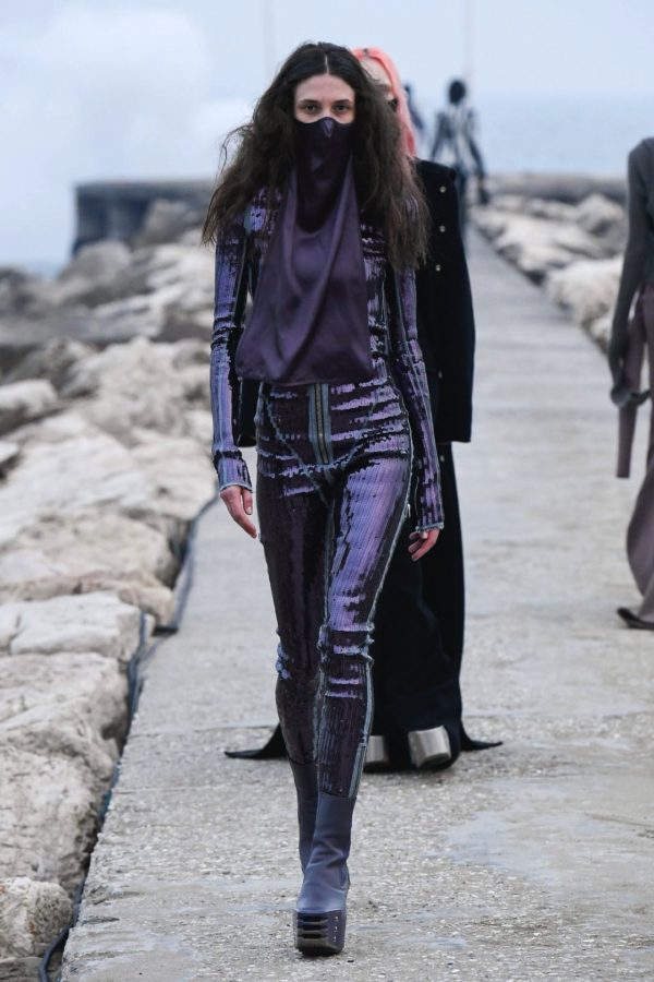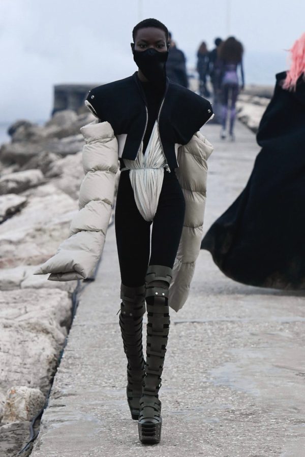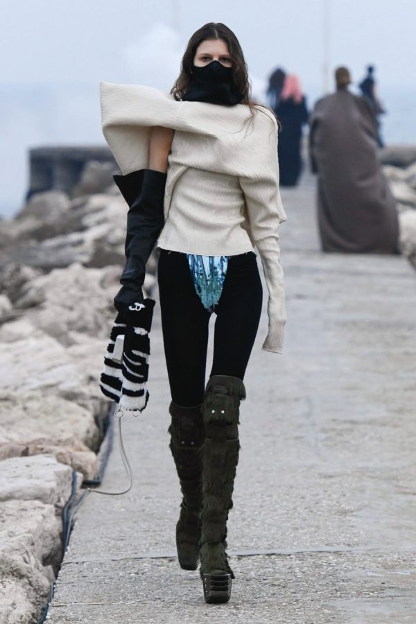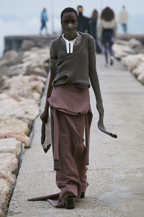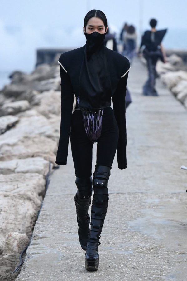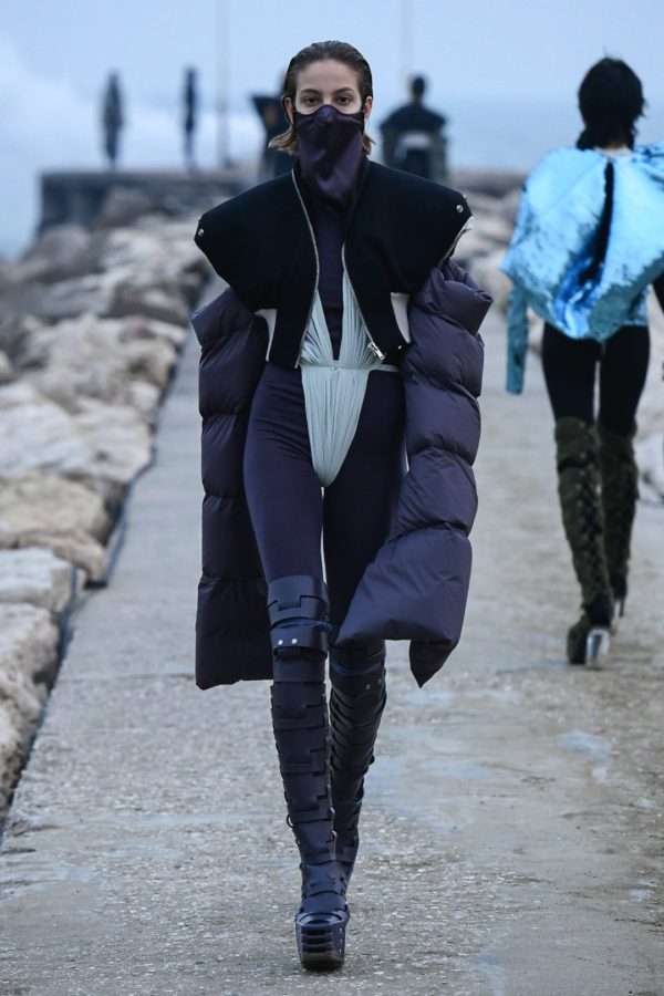 These are topped by power shoulder capes that turn the body into architectural bulldozers, or power shoulder bombers mocking male aggression and conservatism careening off the rails that was the focus of my men’s show in January — coinciding with the shocking events in Washington. These shoulders are a response to fear and anxiety; defiance in the face of threat. I have shown masks with these pandemic shows not because my masks are guaranteed protection, but because they are a vote for responsibility and consideration and an acknowledgement of our immediate collective experience.