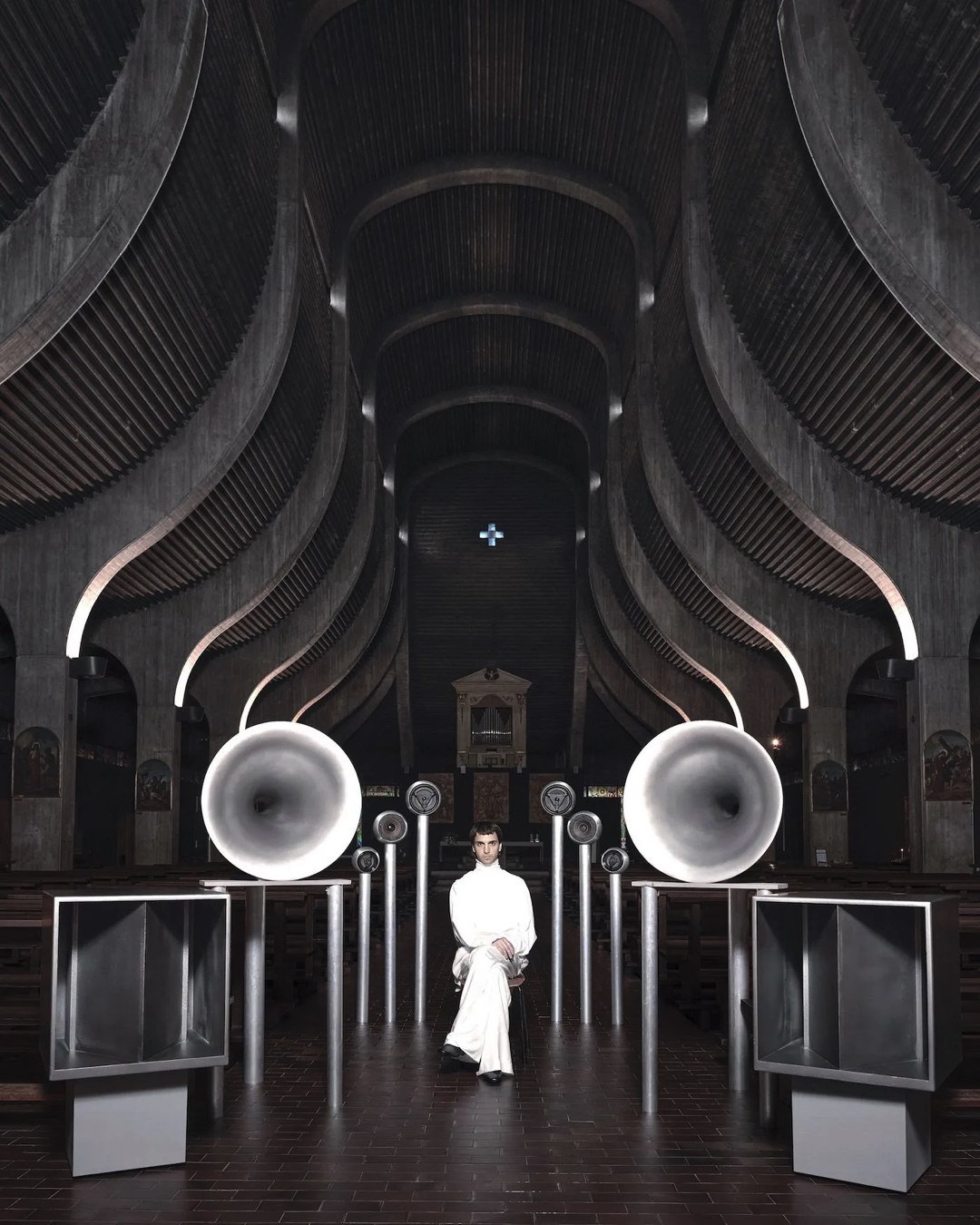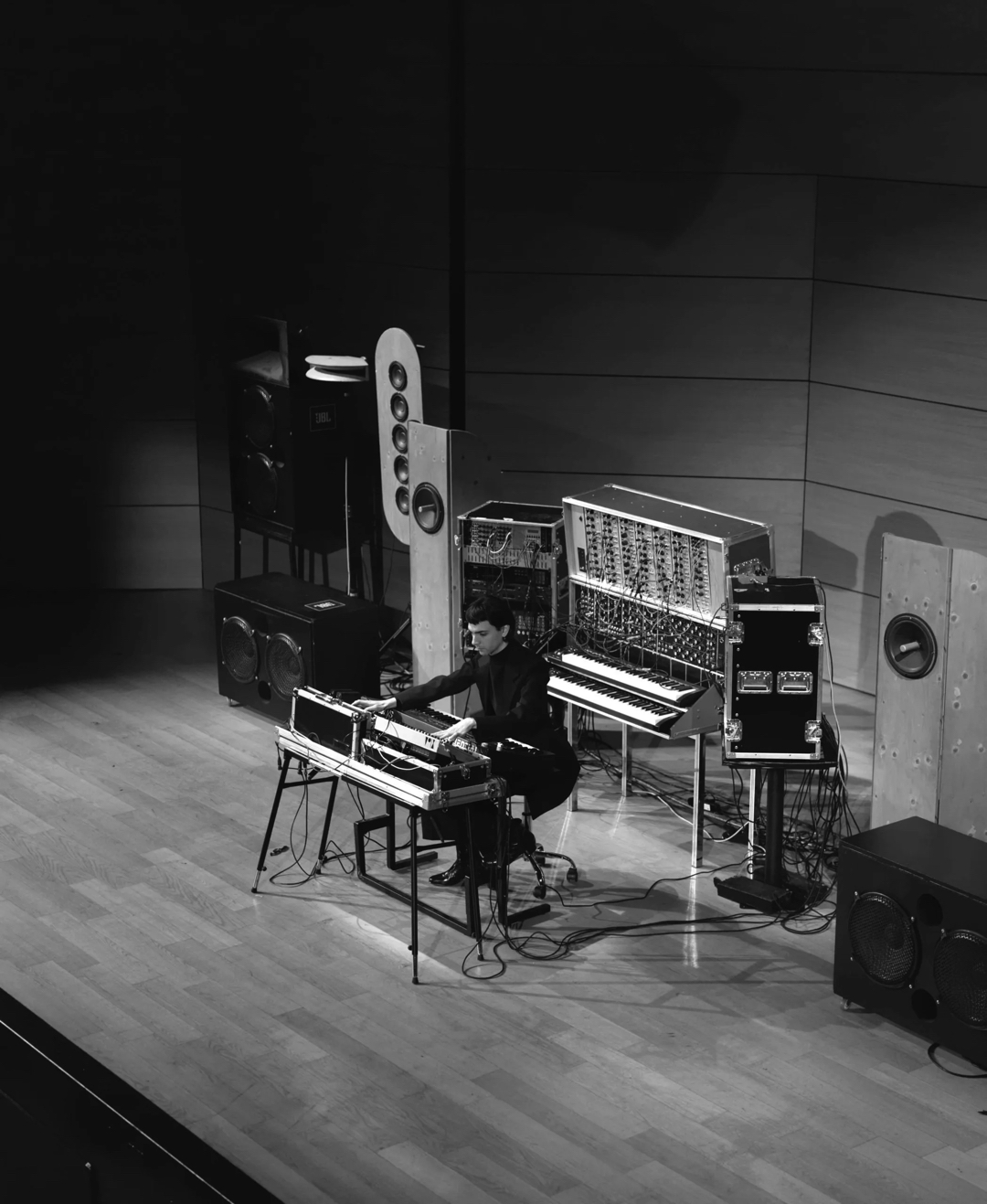 This sensitivity to site also extends beyond music. At Pitti Immagine Uomo, he created a live sonic backdrop that merged urban and natural soundscapes, accompanying choreography and photography in an exploration of how environments shape emotional perception. He also composed and performed the live soundscape for an Ann Demeulemeester Fall / Winter 2025 runway show, where his immersive approach to spatial sound became part of the brand’s atmosphere of dark romanticism, demonstrating how his practice can intersect with fashion as seamlessly as with contemporary art.