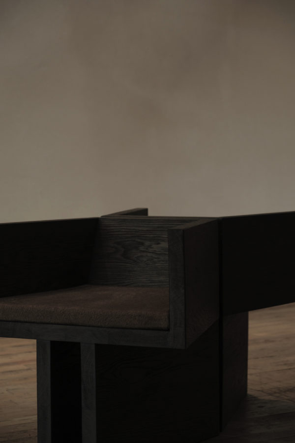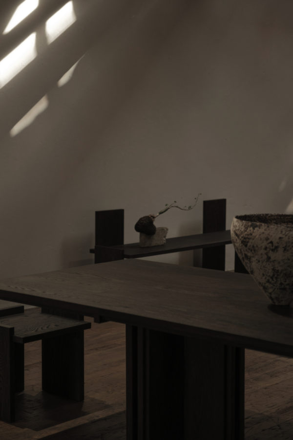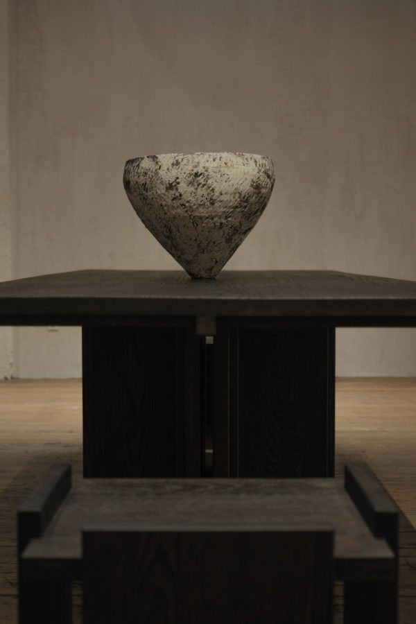 The furniture collection on display are never-before-seen works by Deceres, introducing new shapes that place a special emphasis on texture and thoughtful finishes. The Idro coffee table, in hand-textured aluminum, centers the Sakro chairs, in deeply wire-brushed white oak, together creating a vignette of a place of reverence. The pieces on view include the Olter II Dining Table, Juddas 06-07, and Aequs Side Table, all using a vast breadth of narrative, precision, and construction to imagine a contemporary divinity while honoring the past.