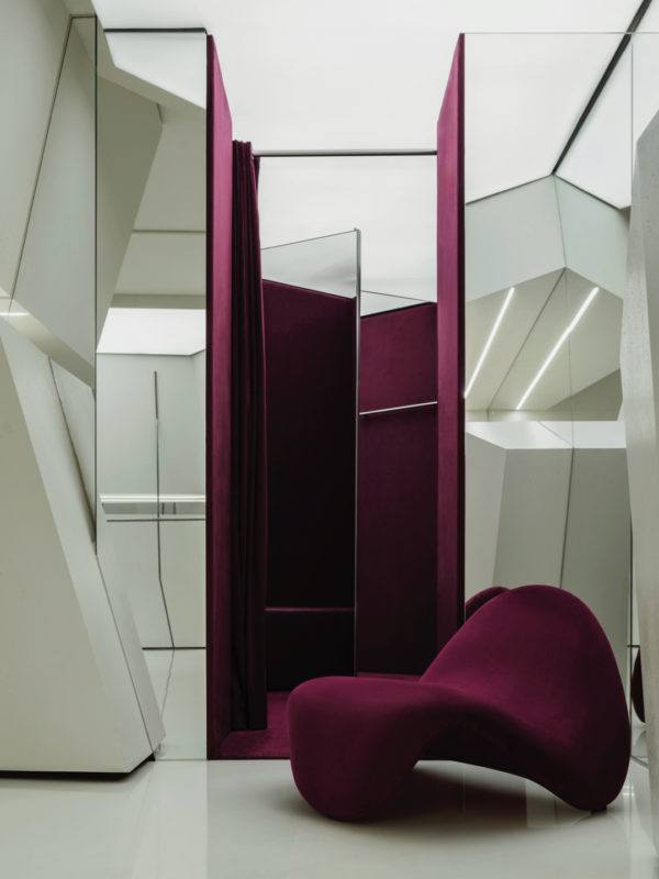 Designed in collaboration with Crab Studio, the interior is defined by geometric plywood structures and mirrored surfaces that create shifting perspectives throughout the space. A mirrored horizon line runs along the perimeter, reinforcing the store’s central theme of observation and perception an idea reflected in its name. Voyeur Voyeur invites visitors to look and be looked at, transforming the act of shopping into a spatial experience.