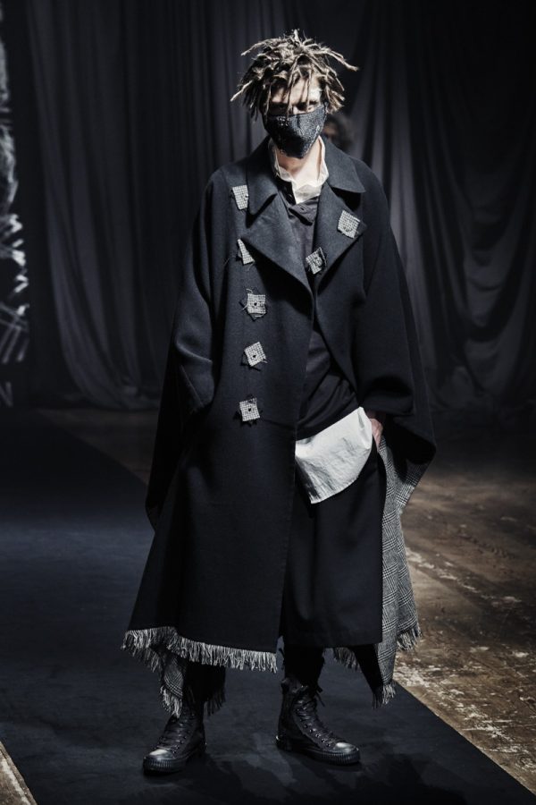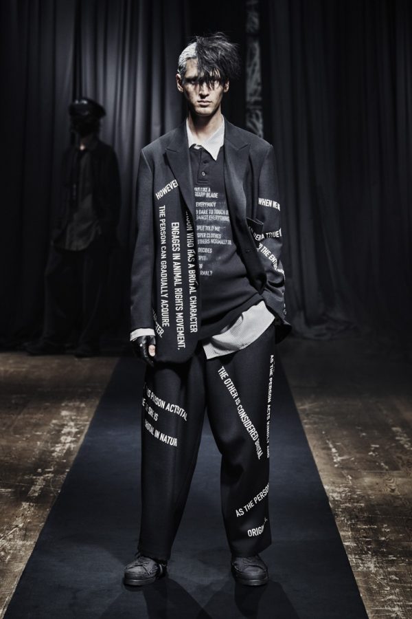 Yohji Yamamoto’s Fall/Winter 2021 menswear collection arrived as a digital presentation, filmed at the Aoyama flagship in Tokyo. Accompanied by the designer’s own voice and compositions, it framed itself as “a statement about today’s world,” but the message was layered with ambiguity. Words were present, printed, embroidered, and scrawled across garments, but the phrases, from “Amazing Grace” to “Born a Terrorist,” lacked narrative cohesion. They registered more as noise than critique, disrupting rather than deepening the collection’s tone.