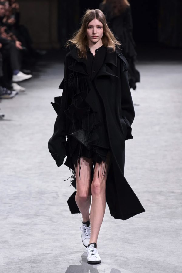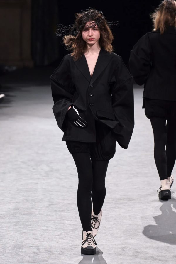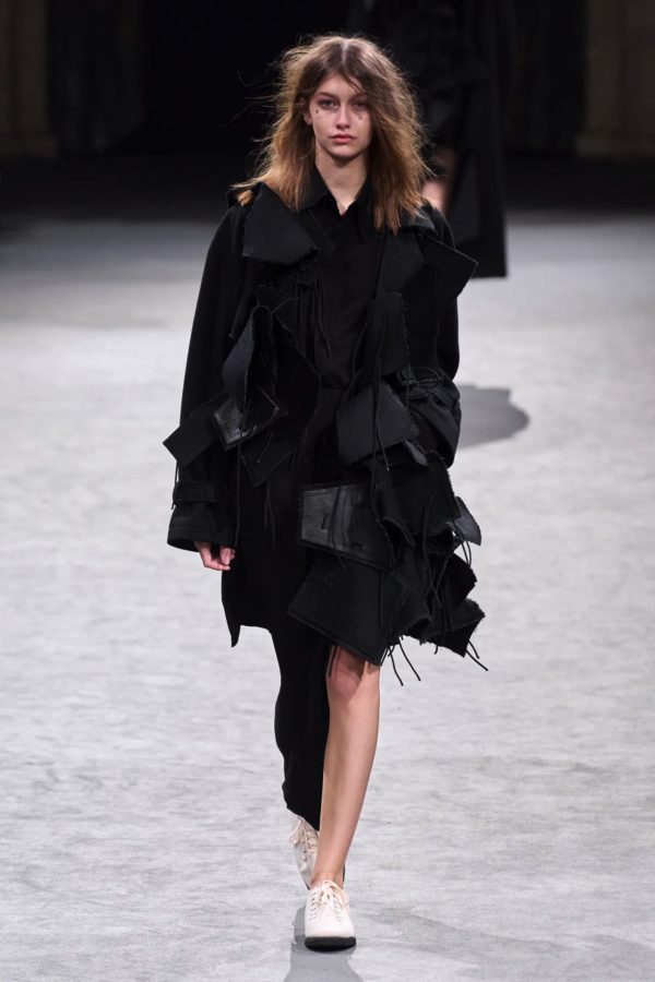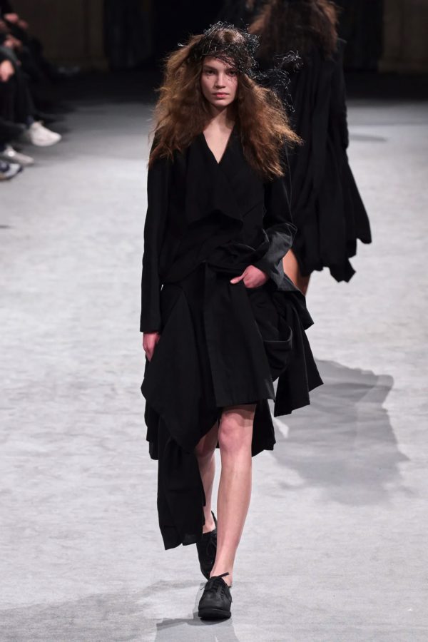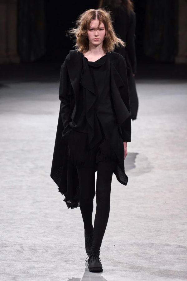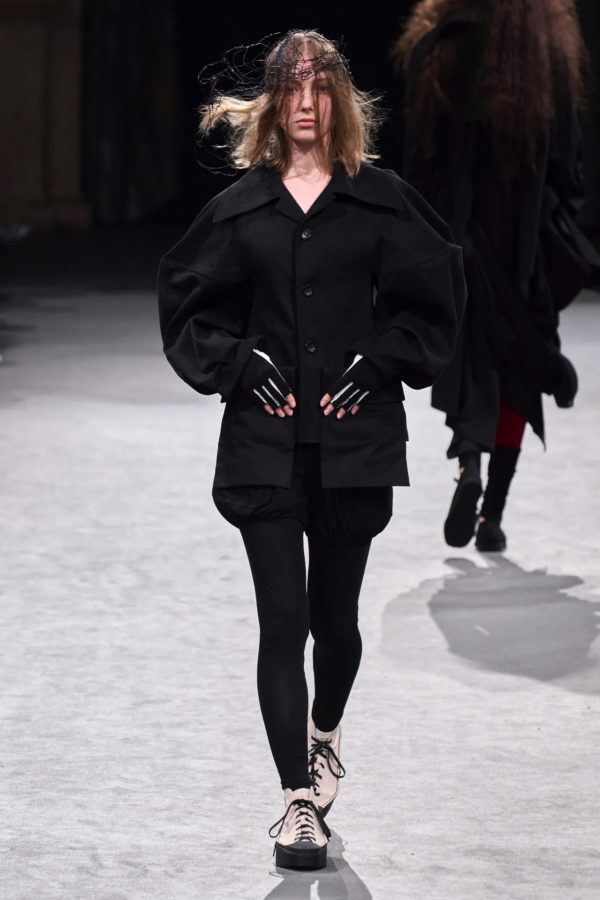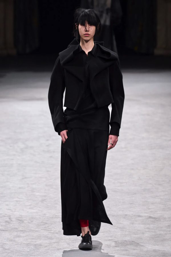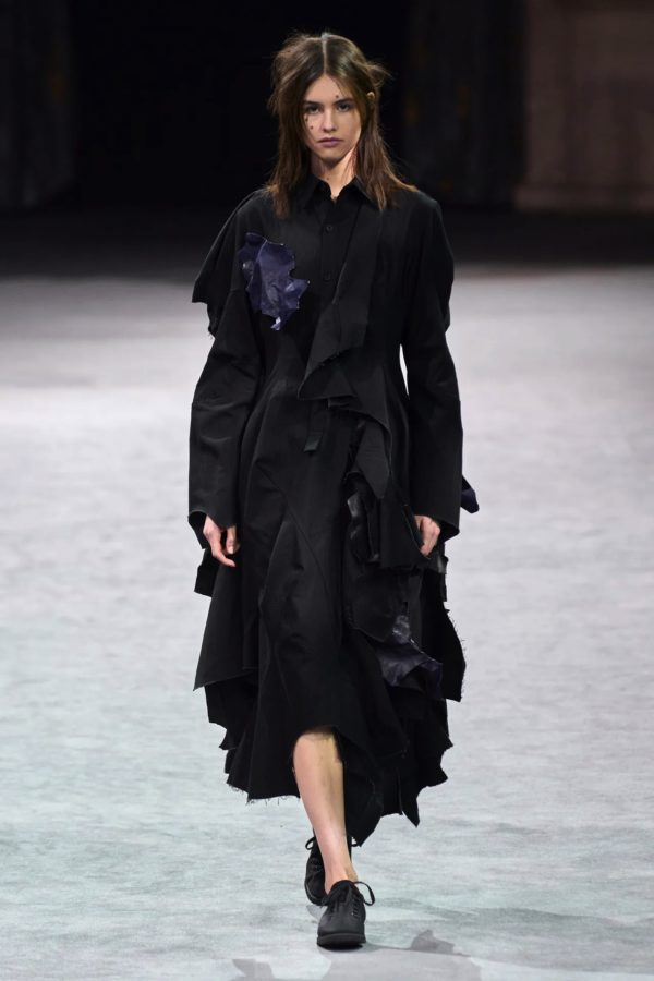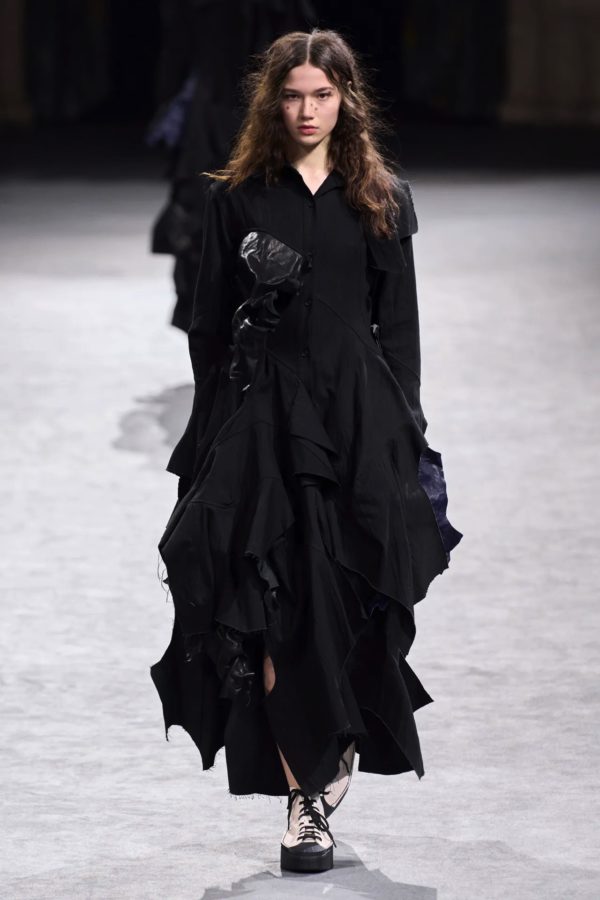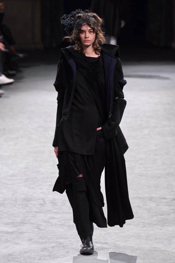 There is no obvious narrative arc, but the presence of the designer is felt throughout. An embroidered self-portrait appears on a zippered shirt, showing Yamamoto with his guitar and hat in hand. It is not branding. It is acknowledgment. The final song, sung in Japanese, told of a man aging with mixed emotions—regret, but also satisfaction. The clothes mirrored that duality. They were imperfect, deliberately so. Hair was mussed. Makeup looked unfinished. Fabrics twisted and hung with precision that masked their complexity.