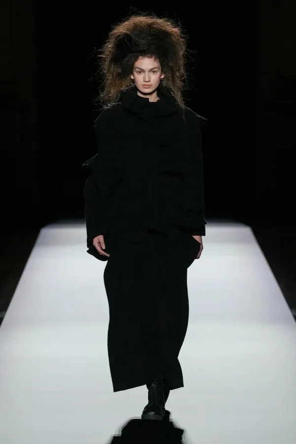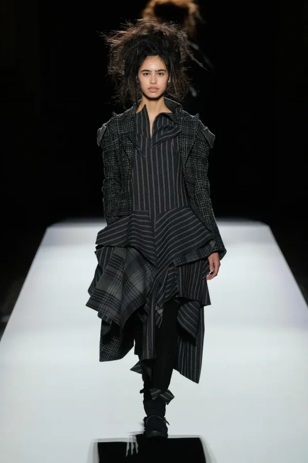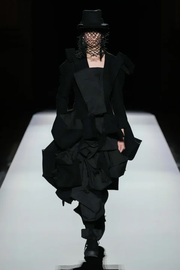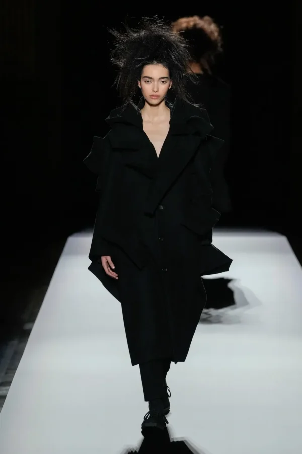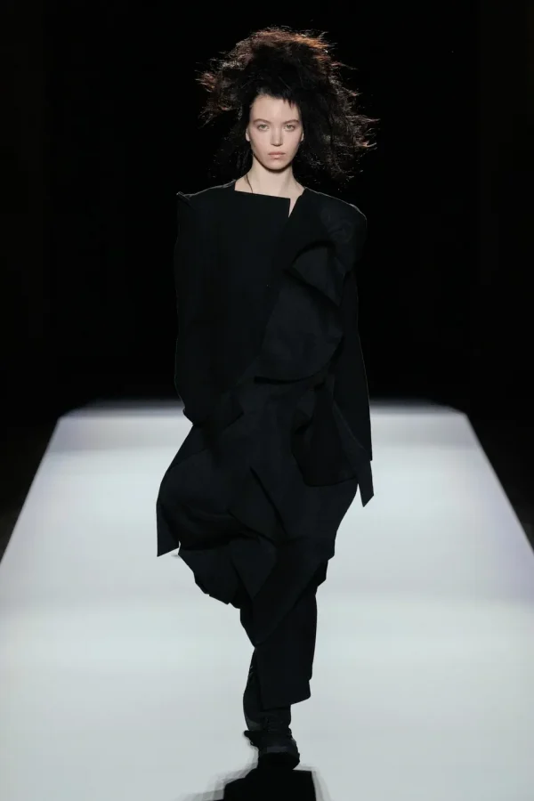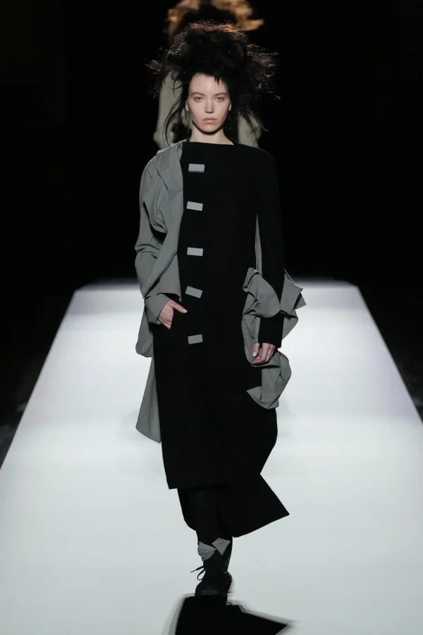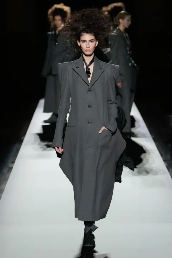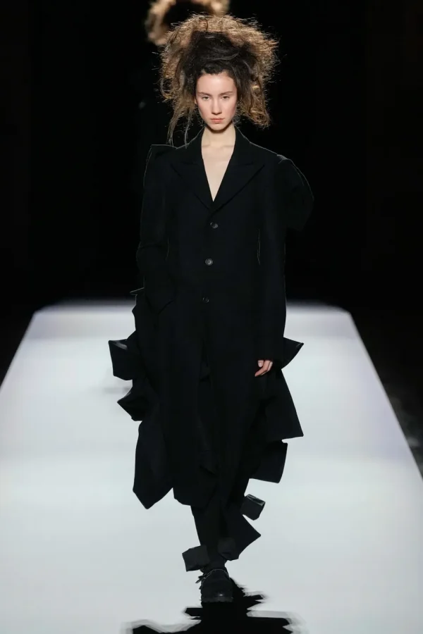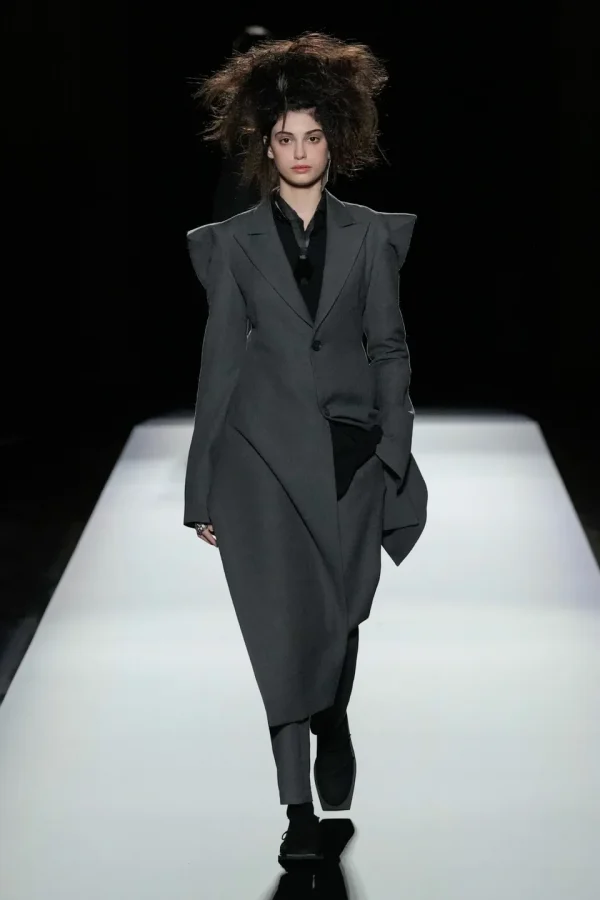 Backstage, Yamamoto remained enigmatic yet engaged, offering brief insights into his creative process. His use of pyramidal shoulders in the final looks—a departure from the experimental designs that preceded them—underscored his ability to subvert expectations while maintaining a cohesive narrative. The addition of lavish bustles to the muted gray suits and coats added a whimsical touch, reminiscent of organic forms and contrasting with the earlier geometric rigor.