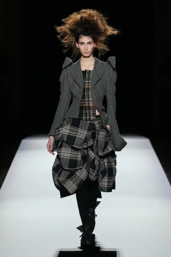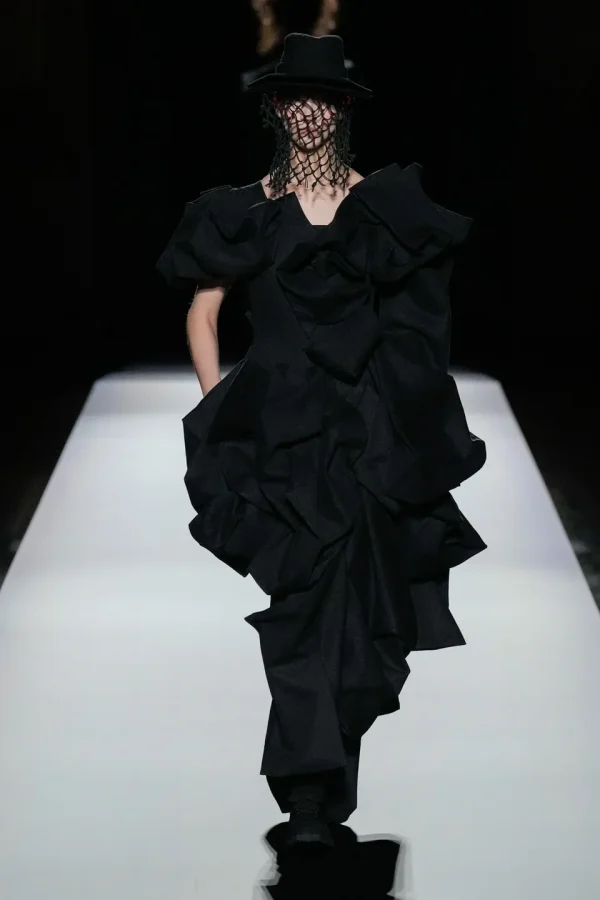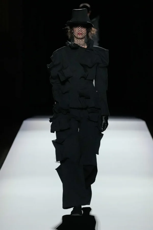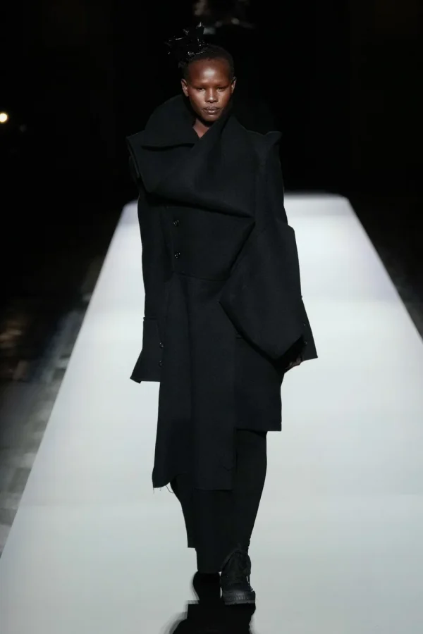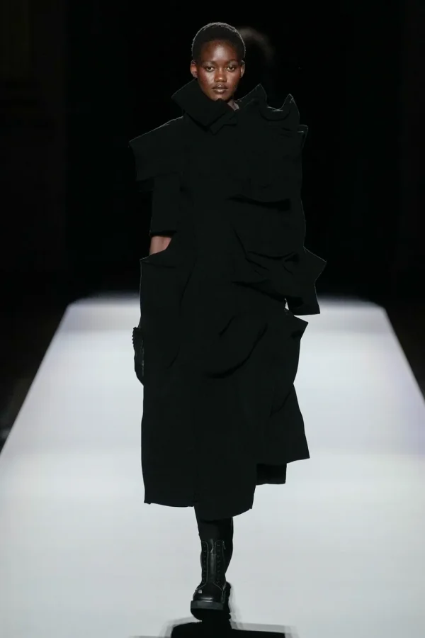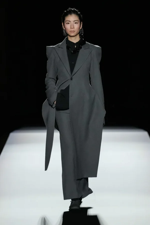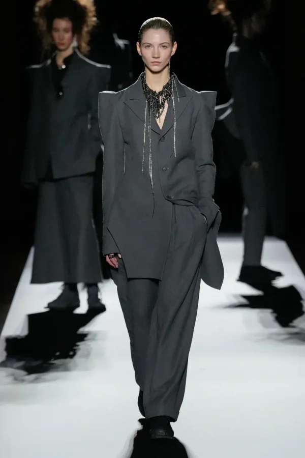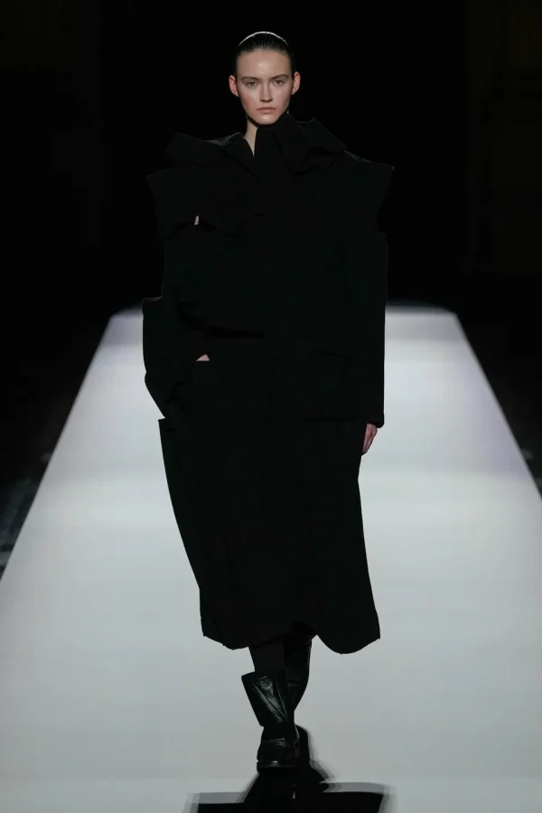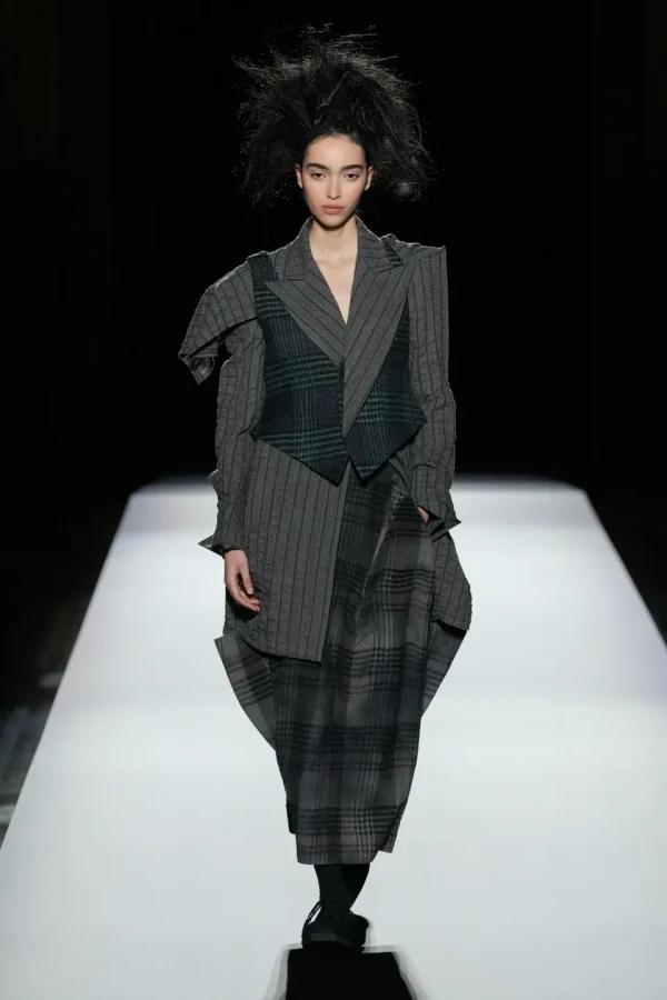 Backstage, Yamamoto remained enigmatic yet engaged, offering brief insights into his creative process. His use of pyramidal shoulders in the final looks—a departure from the experimental designs that preceded them—underscored his ability to subvert expectations while maintaining a cohesive narrative. The addition of lavish bustles to the muted gray suits and coats added a whimsical touch, reminiscent of organic forms and contrasting with the earlier geometric rigor.