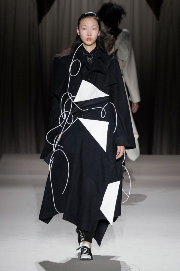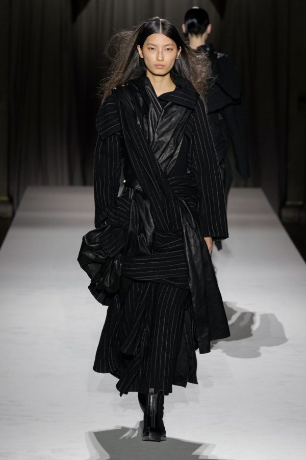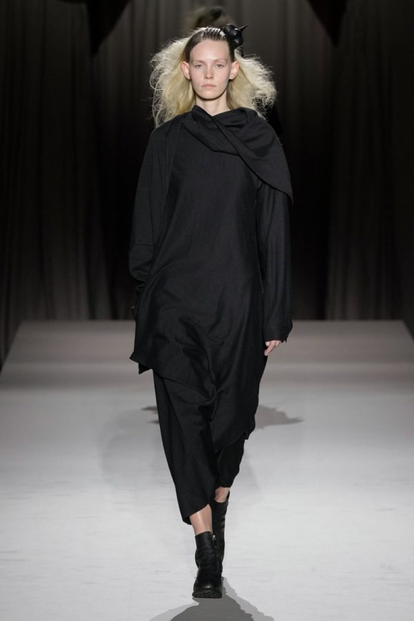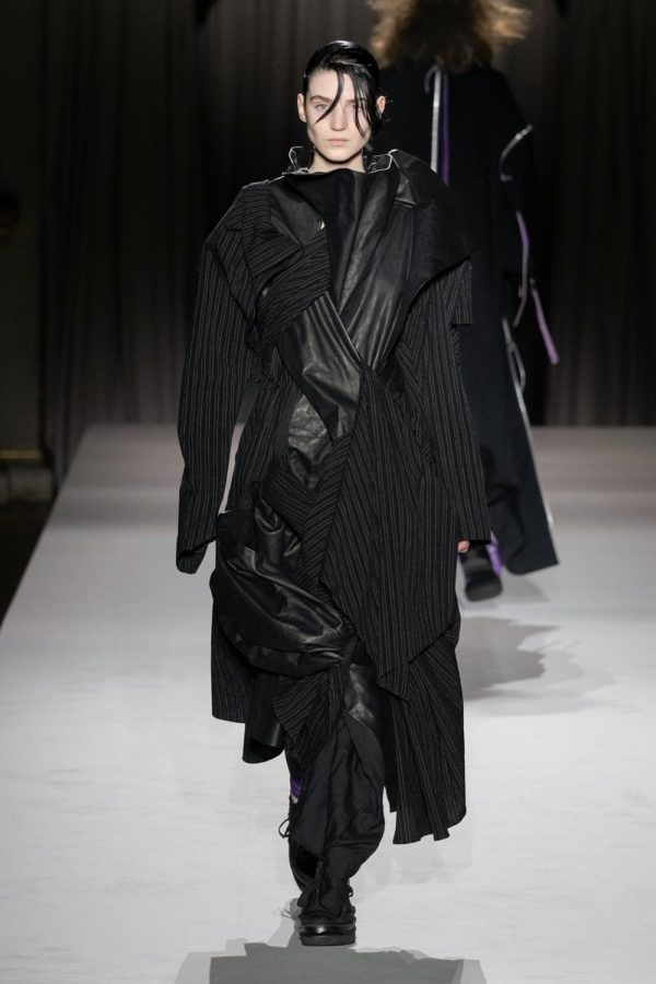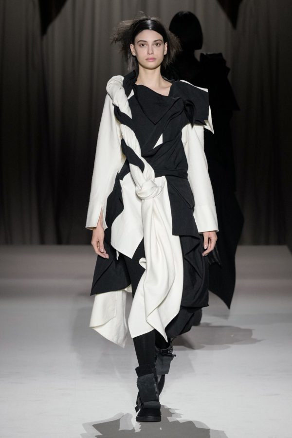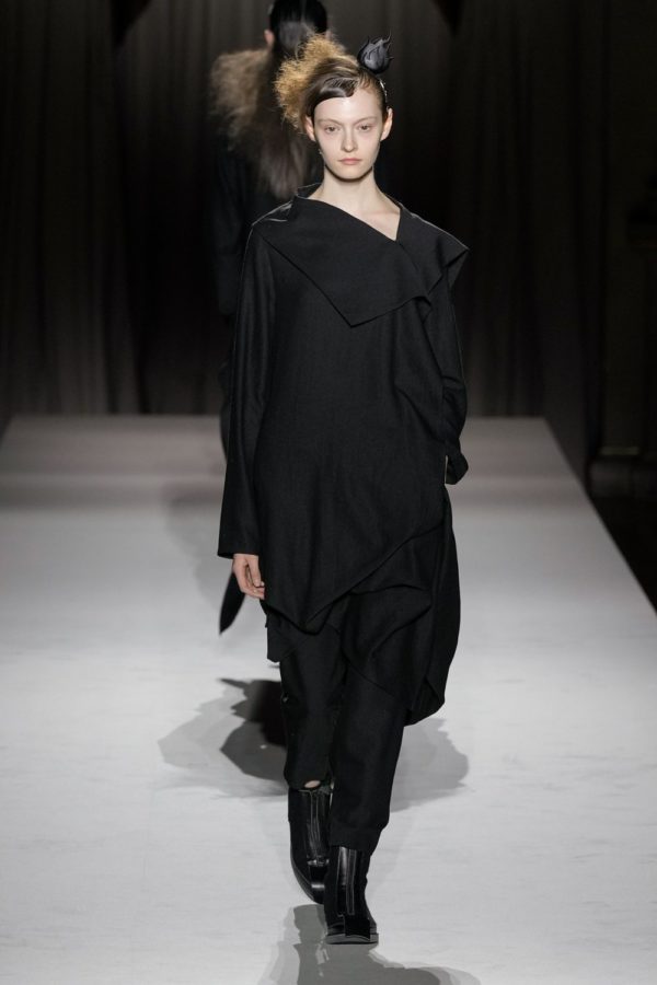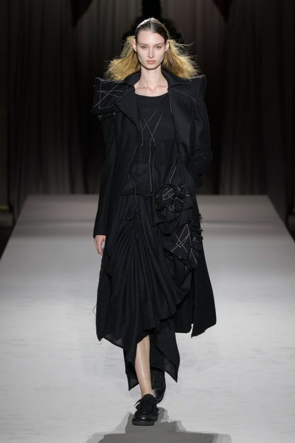 Despite their complexity, Yamamoto’s coats never stray into costume. They are lived-in, wearable, they belong to the city, to the streets of Paris or New York, where one could easily imagine his woman moving through the world, unburdened yet deeply intentional. Flat shoes reinforced this grounded sensibility, lending even the most elaborate compositions an air of effortless pragmatism.