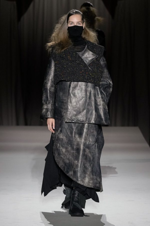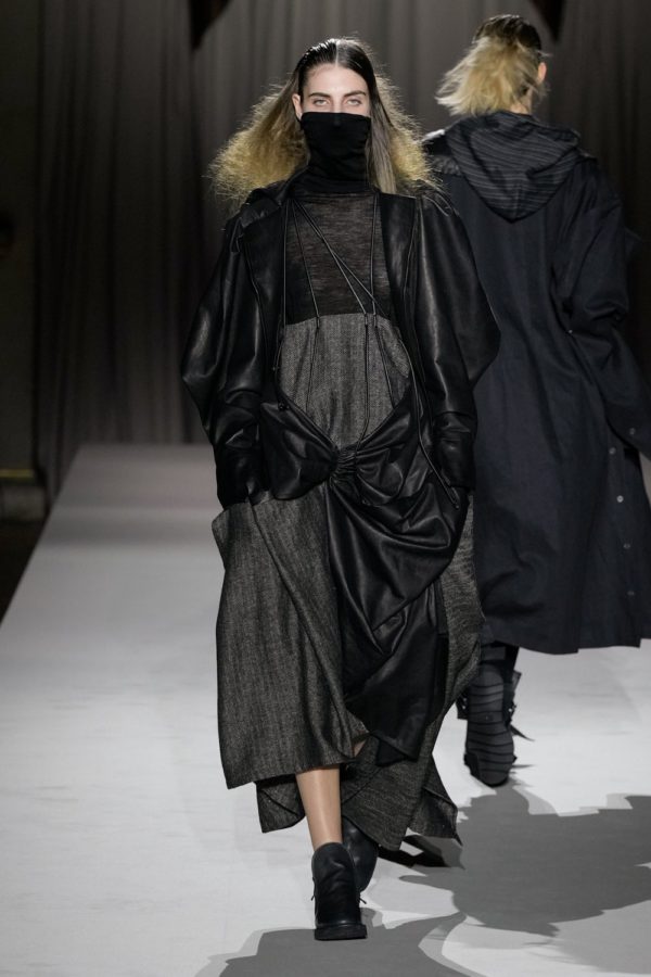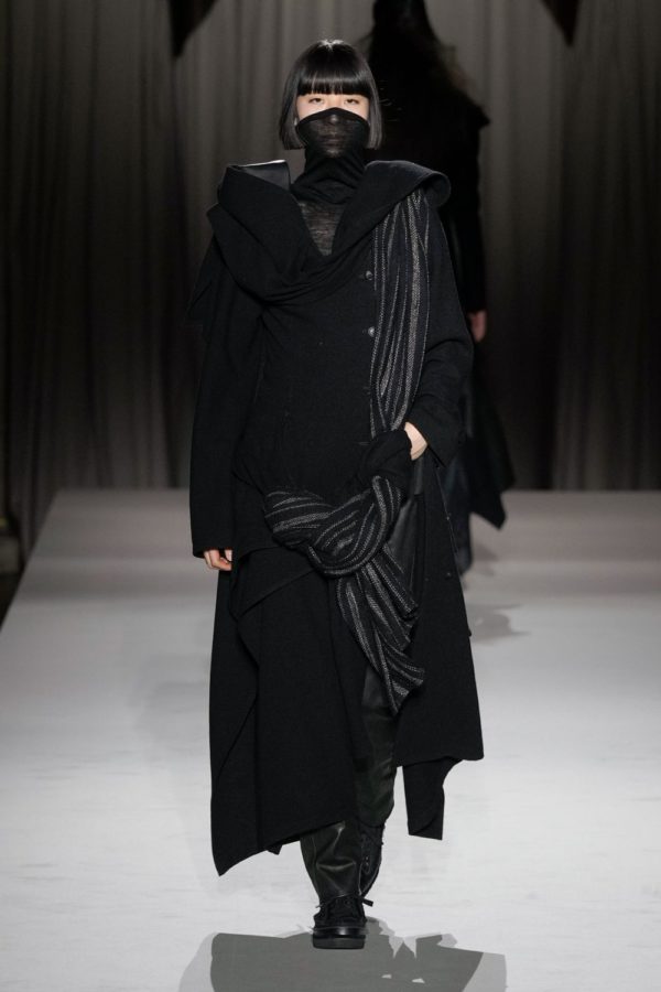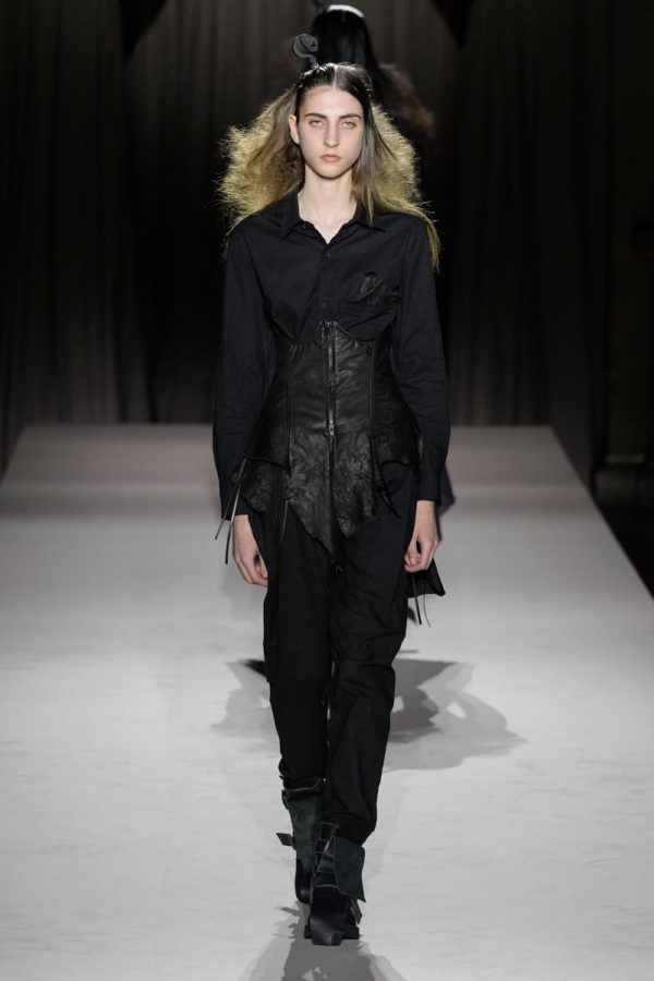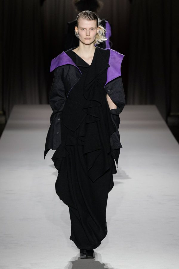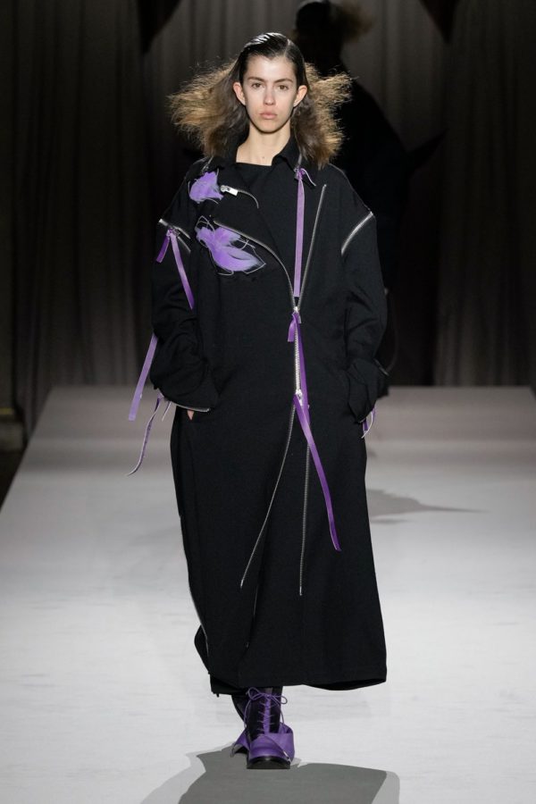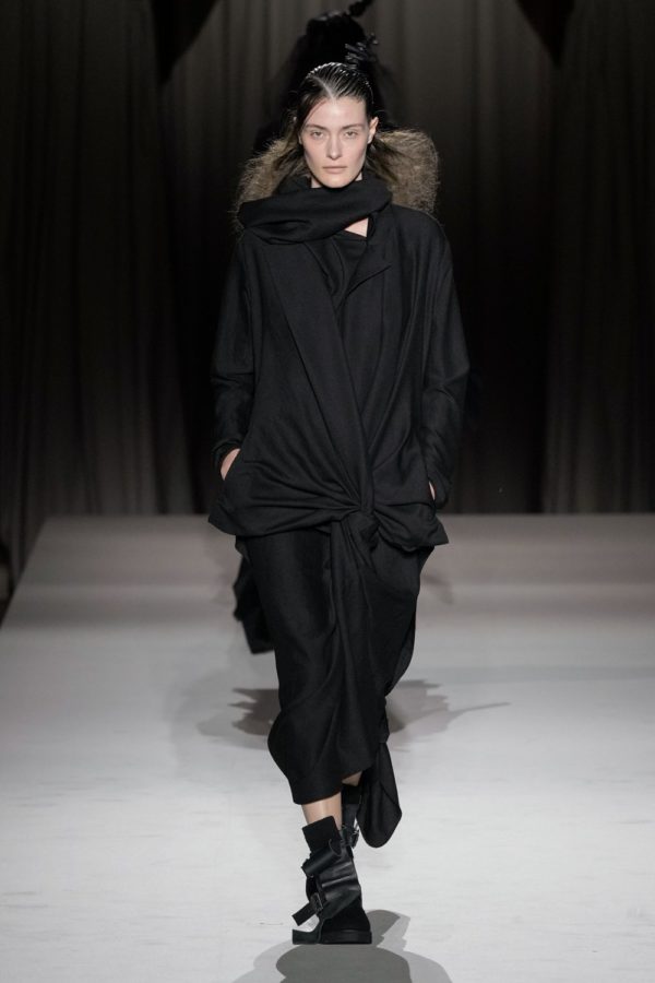 Despite their complexity, Yamamoto’s coats never stray into costume. They are lived-in, wearable, they belong to the city, to the streets of Paris or New York, where one could easily imagine his woman moving through the world, unburdened yet deeply intentional. Flat shoes reinforced this grounded sensibility, lending even the most elaborate compositions an air of effortless pragmatism.