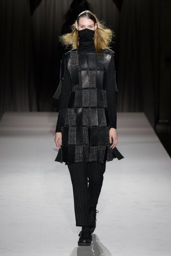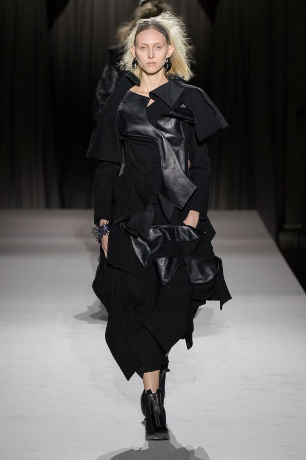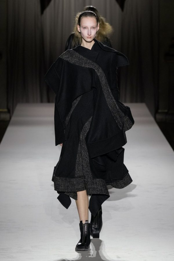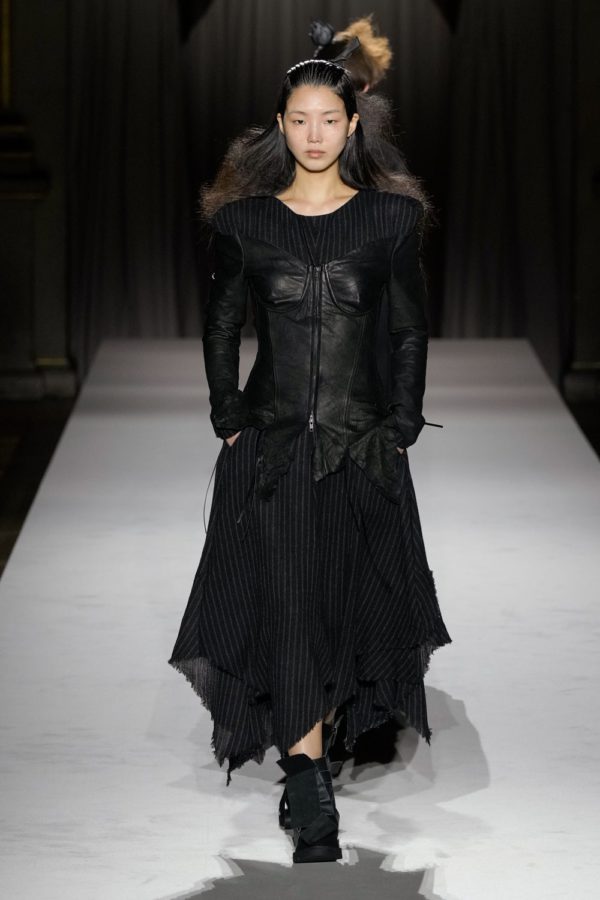 Much like his men’s collection earlier this year, outerwear took center stage. But while his menswear show toyed with convention, introducing puffers that felt almost subversive in their normalcy, this women’s collection remained true to his signature language. Swaddling silhouettes, asymmetrical constructions, integrated scarves twisting around the body, each piece was a masterclass in controlled deconstruction. Patchworked corsets appeared throughout, not to sculpt the figure but to draw fabric closer to it, emphasizing a tactile intimacy between garment and wearer.