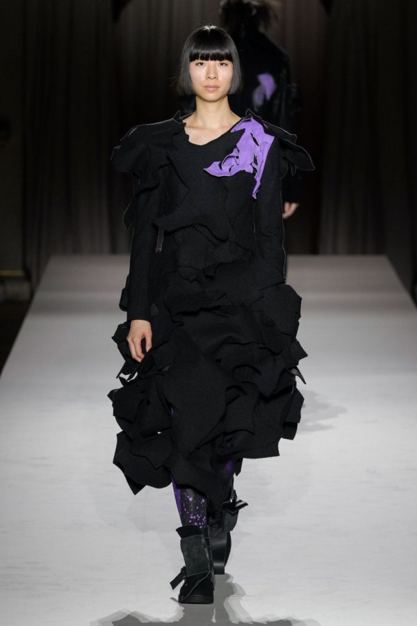 Elsewhere, geometric embellishments in white and purple disrupted the black expanse of wool and felt, while tangled cords sketched abstract patterns across the torso. There is always a painterly quality to his work, as though each piece is an ongoing dialogue between fabric and form, structure and dissolution.