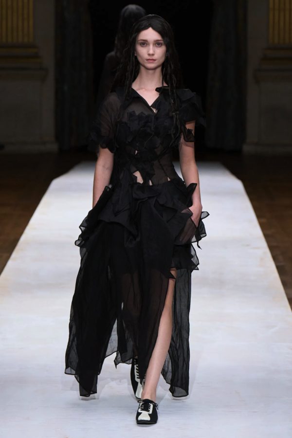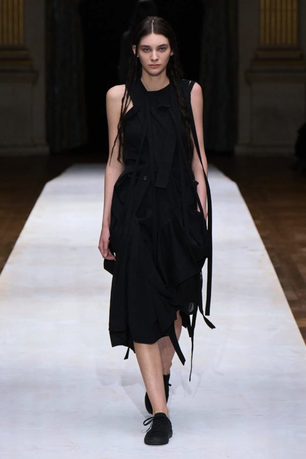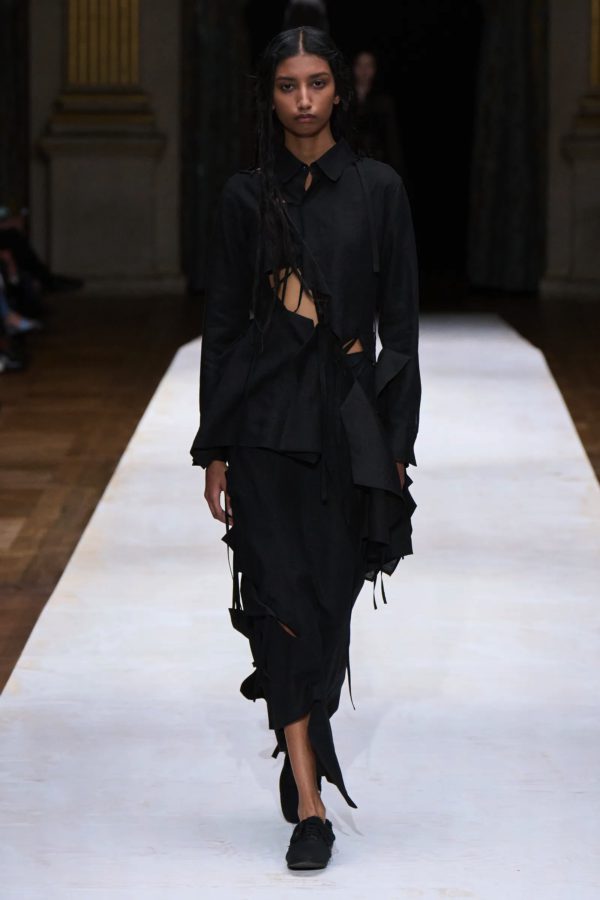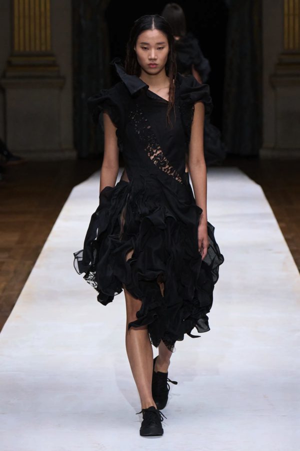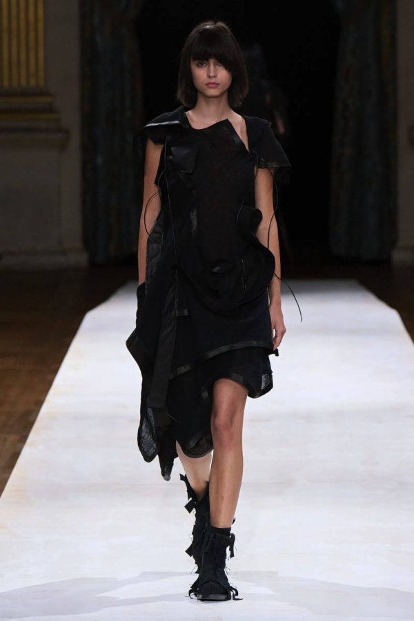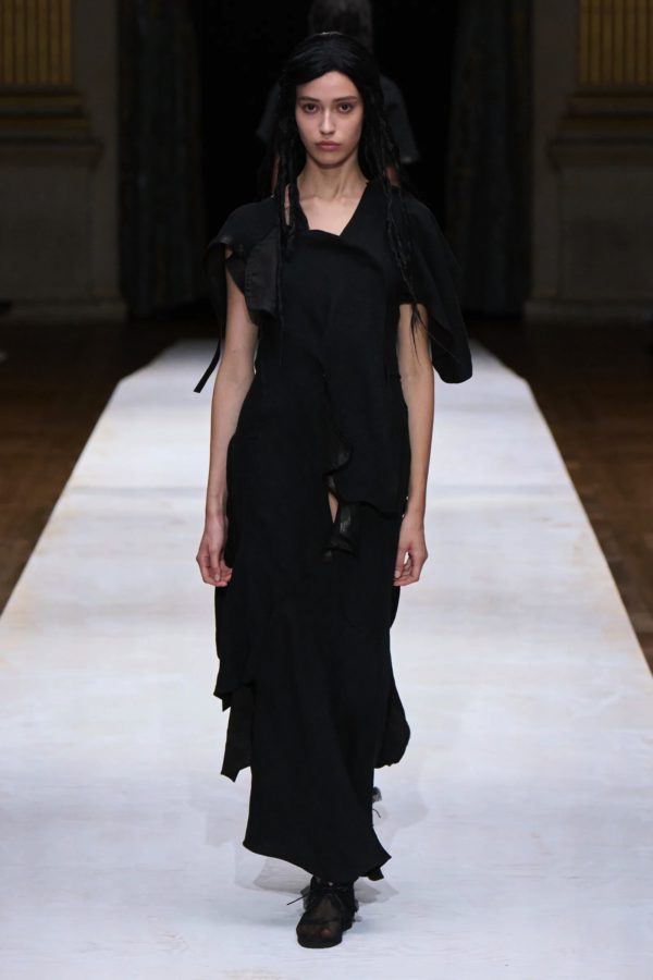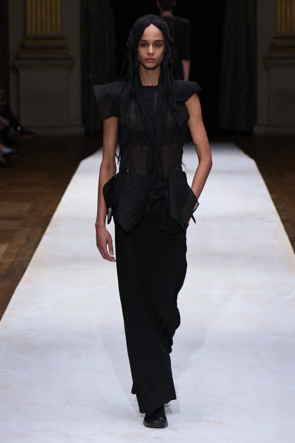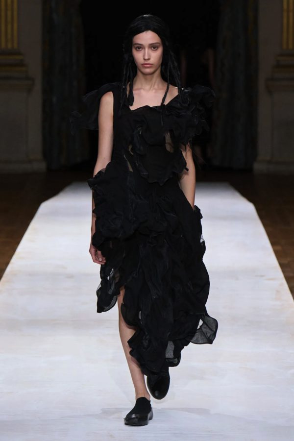 A notable aspect was Yamamoto’s exploration of black, a departure from his previous ventures into color. Much like Pierre Soulages’ exploration of light and dark in his paintings, Yamamoto embraced the multifaceted dimensions of black. The ensembles featured layers of pleats and tucks, taking black into a realm of multi-dimensionality. Sheer fabrics and distinctive footwear added to the weightless shapes, emphasizing black’s connection with the female form.