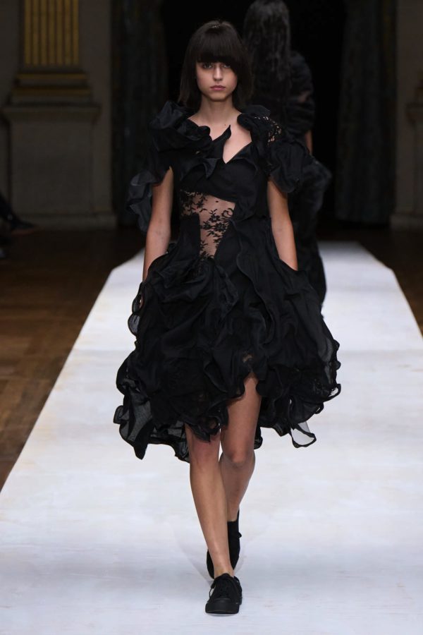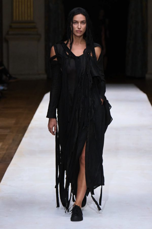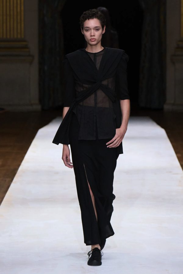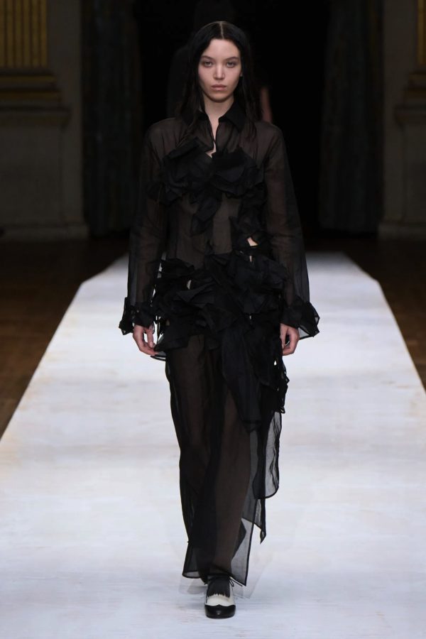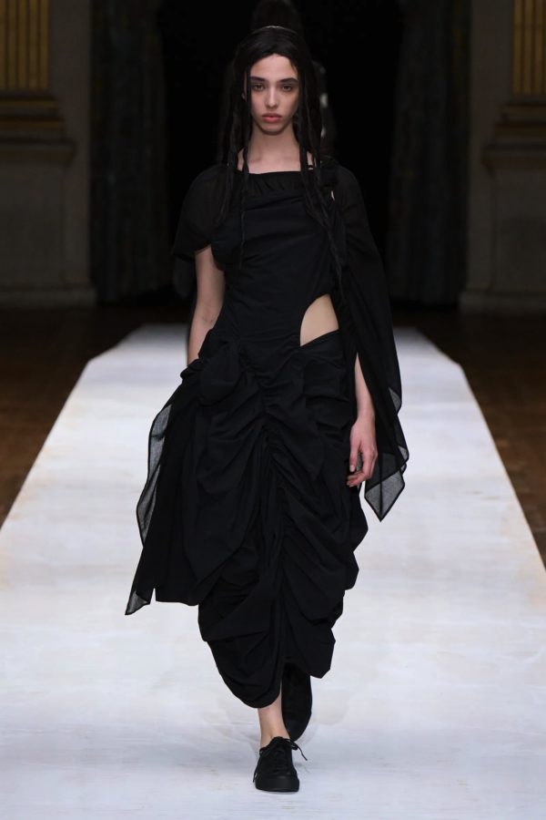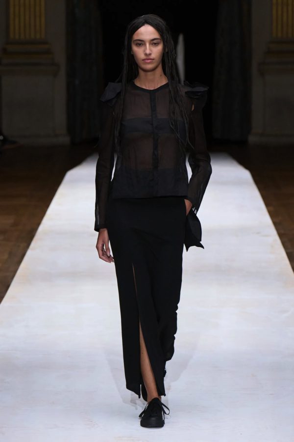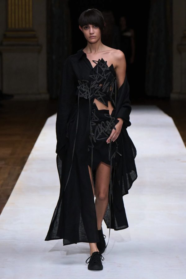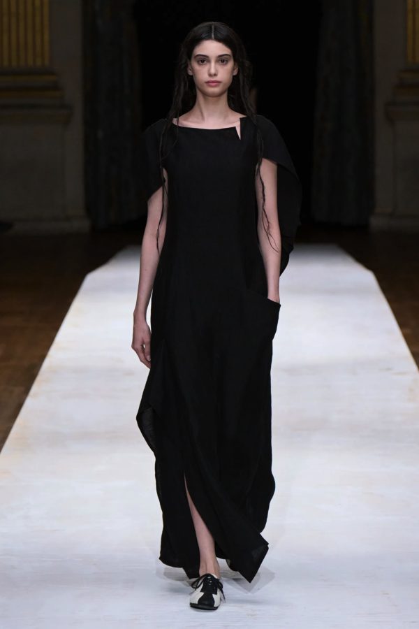 A notable aspect was Yamamoto’s exploration of black, a departure from his previous ventures into color. Much like Pierre Soulages’ exploration of light and dark in his paintings, Yamamoto embraced the multifaceted dimensions of black. The ensembles featured layers of pleats and tucks, taking black into a realm of multi-dimensionality. Sheer fabrics and distinctive footwear added to the weightless shapes, emphasizing black’s connection with the female form.