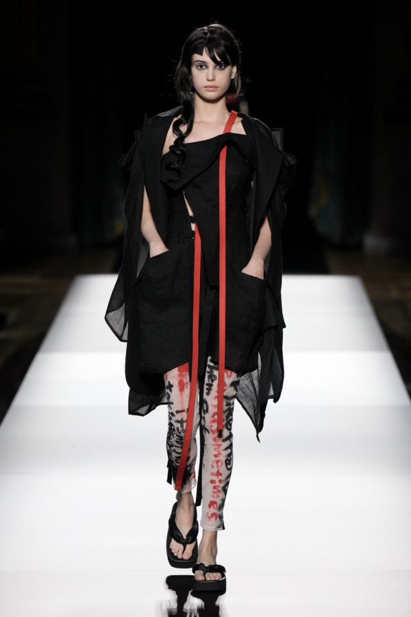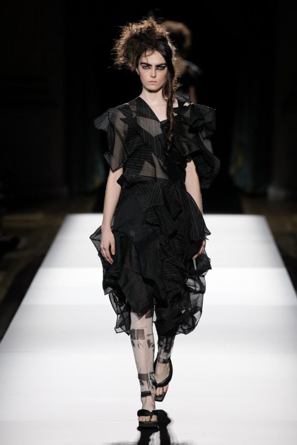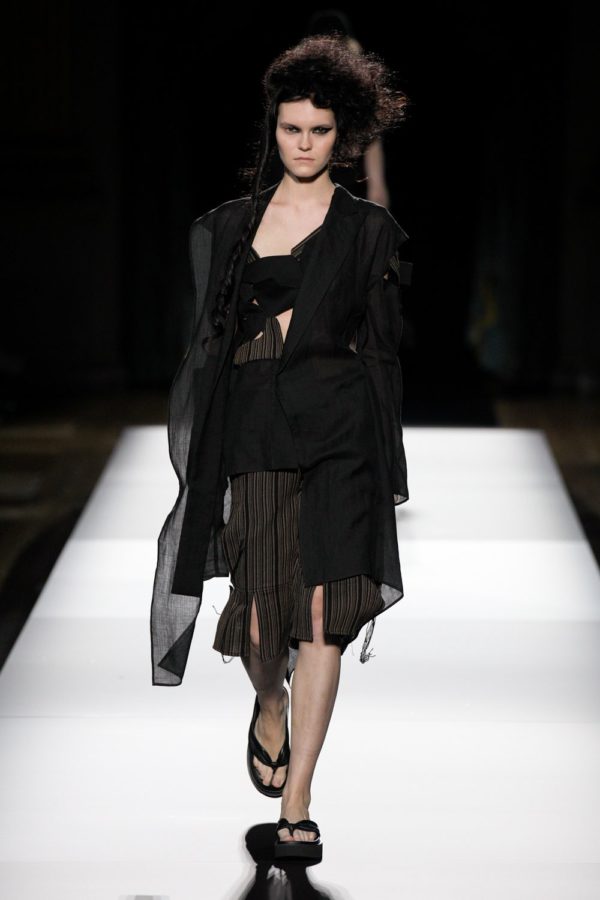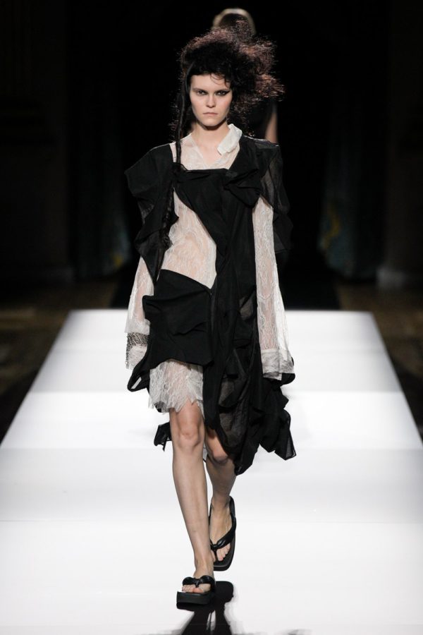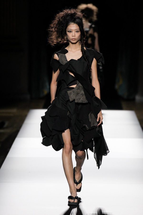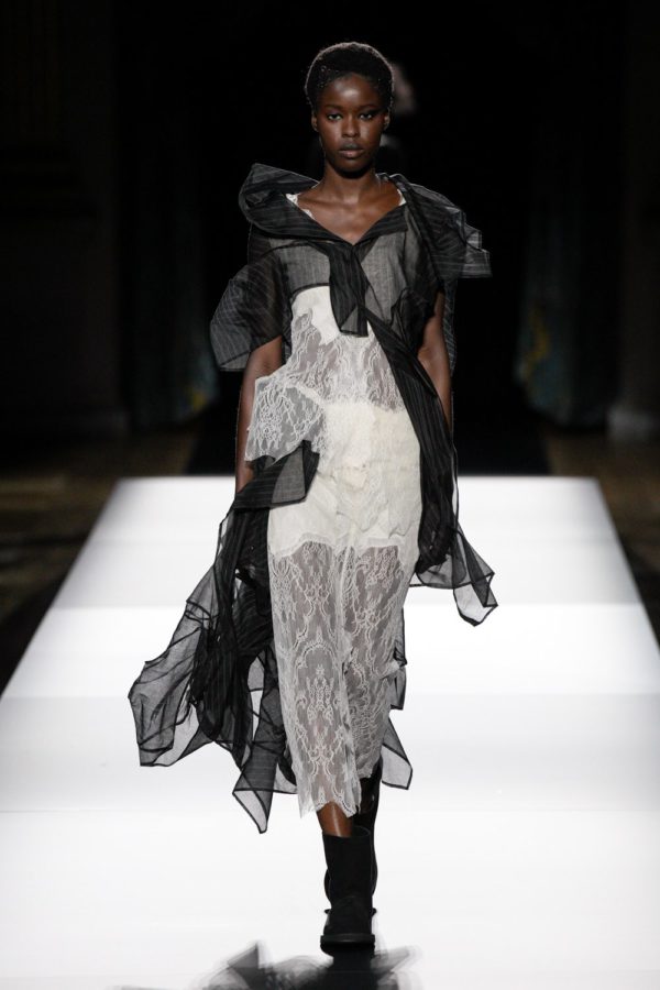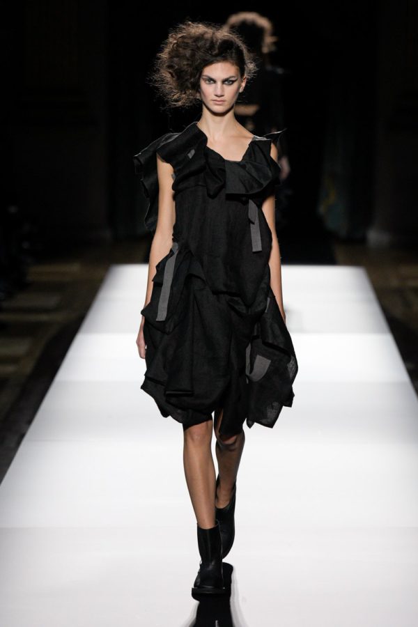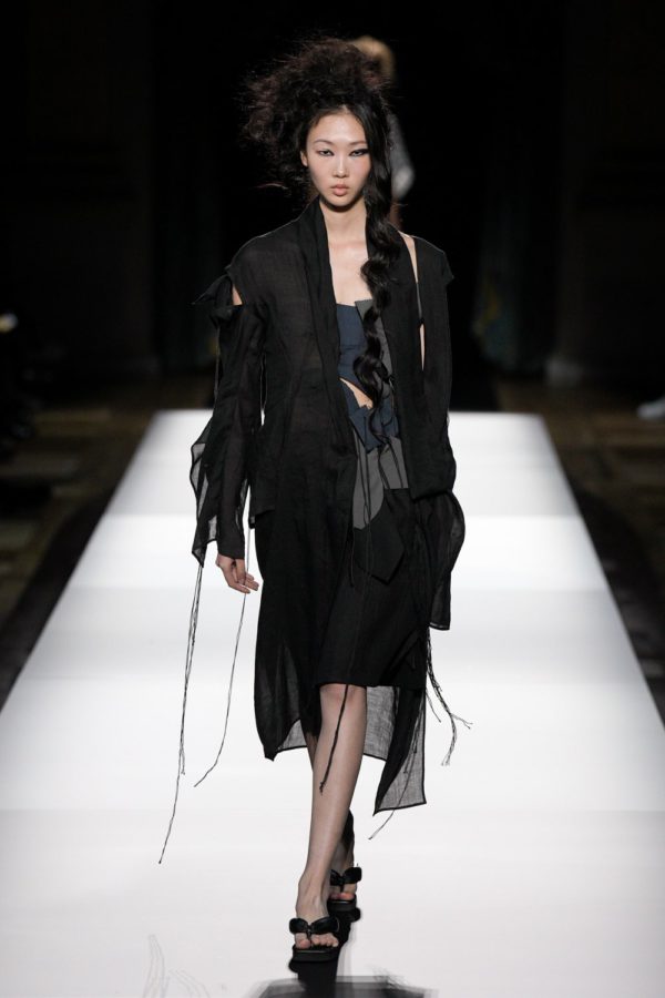 In Yohji Yamamoto’s latest collection, the designer continues to navigate the delicate interplay between fragility and strength, offering a reflection on the complexities of modern femininity through a masterful manipulation of fabrics.