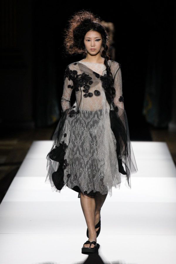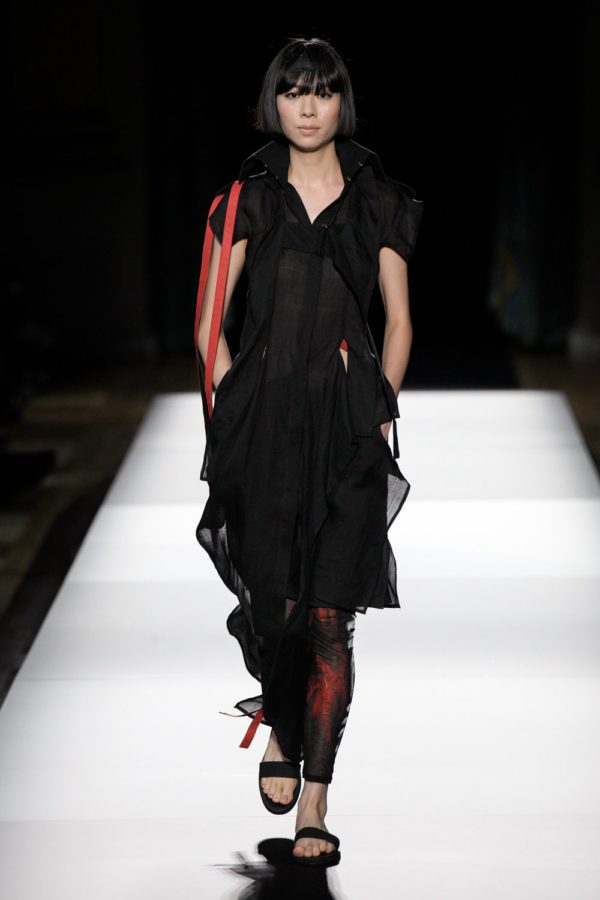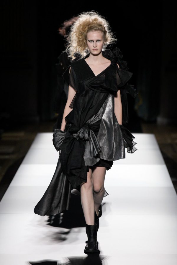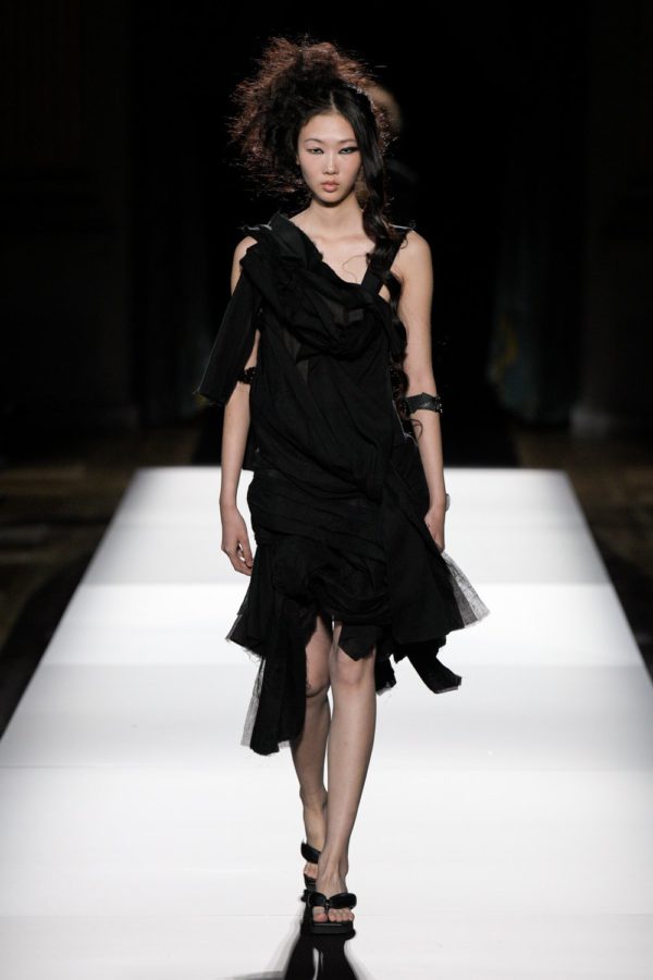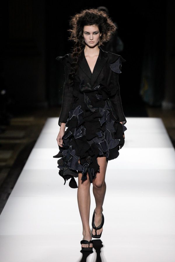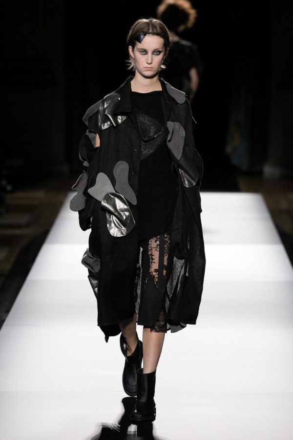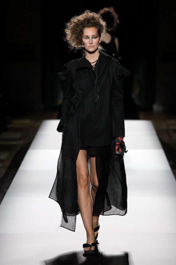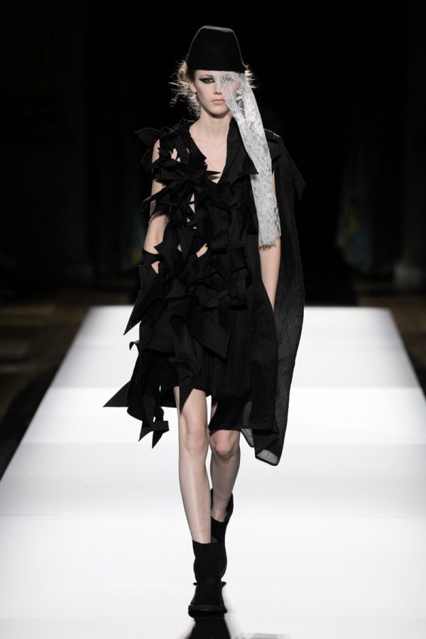 In Yohji Yamamoto’s latest collection, the designer continues to navigate the delicate interplay between fragility and strength, offering a reflection on the complexities of modern femininity through a masterful manipulation of fabrics.