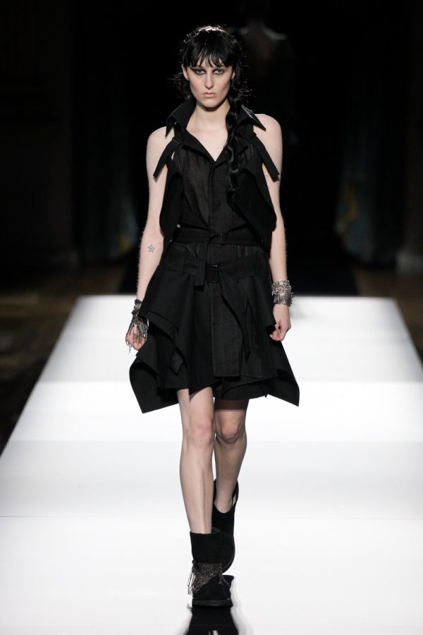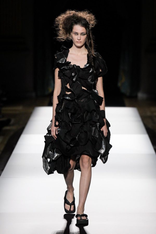 This season’s collection, characterized by its seemingly haphazard yet deeply intentional construction, evokes a narrative of reconstruction and resilience, suggesting a woman reassembling herself from remnants. The designs featured fragmented garments—straps left undone, jagged hems, and scraps of fabric reassembled—each piece contributing to an overarching aesthetic of raw transformation. Throughout the show, models moved in garments that felt simultaneously deconstructed and highly crafted, echoing a theme of reinvention. Long, buckled straps trailed behind as fabric swatches, some torn and others loosely stitched, jutted from skirts and dresses. These rugged details were softened by a smoky eye shadow encircling only one eye and the ethereal lace veils that half-obscured faces.