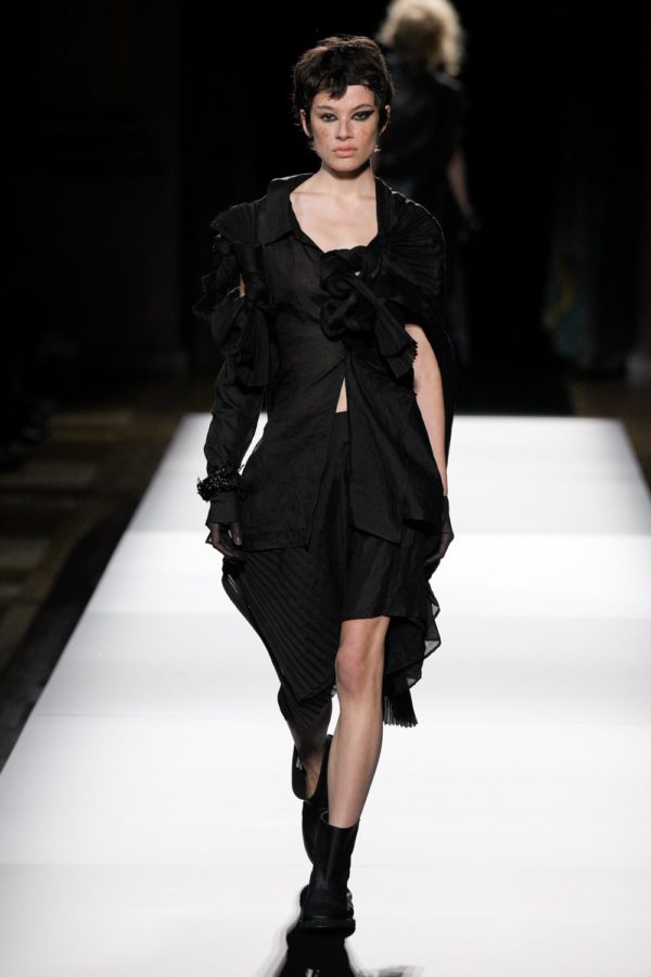 The duality of fragility and empowerment, a recurring motif in Yamamoto’s oeuvre, was palpable, resonating with similar themes explored by other designers this season. The emotional depth of the collection was underscored by the music, a poignant arrangement of Bach, Gluck, and Ravel, performed live by celebrated pianist Pavel Kolesnikov. As the show progressed, Kolesnikov’s sorrowful melodies gave way to a darker recording—Yamamoto’s remix of Leonard Cohen’s “You Want It Darker”. The haunting refrain—“Vilified, crucified, in the human frame / A million candles burning for the help that never came”—added a layer of existential reflection to the runway. Yet, despite these somber undercurrents, Yamamoto himself struck an optimistic tone, describing the collection as the work of “kids.” His lighthearted remark, “They made it!” offered insight into his playful approach to the season’s designs.
