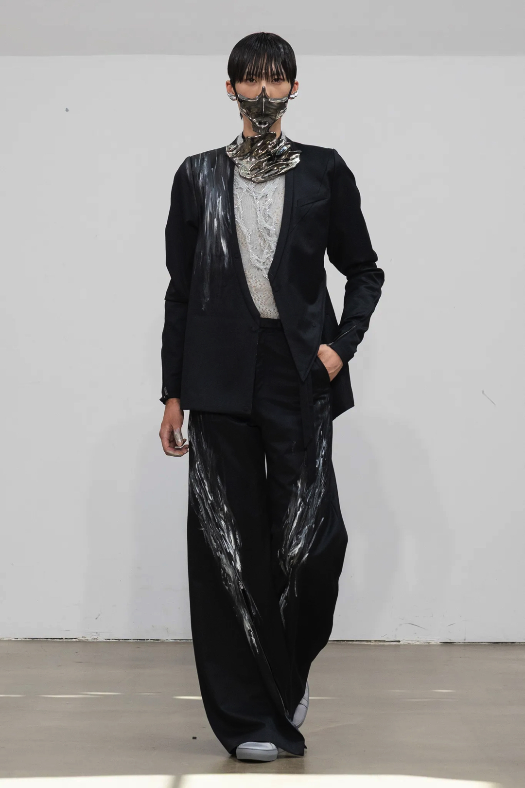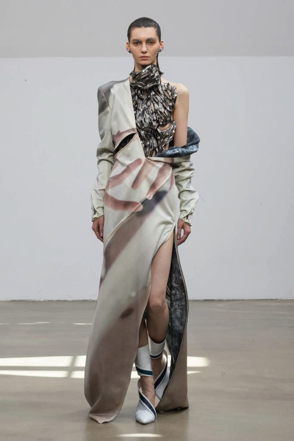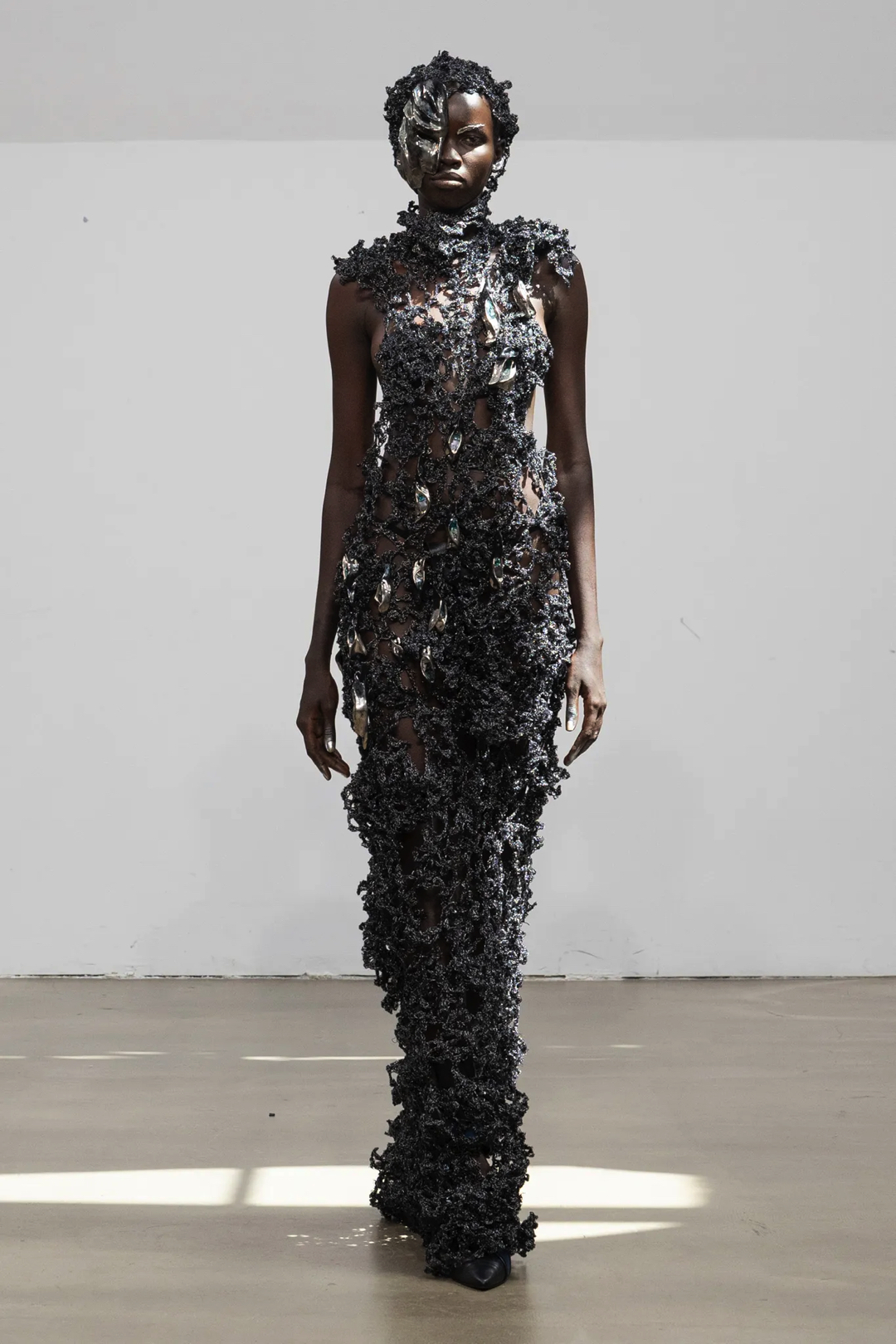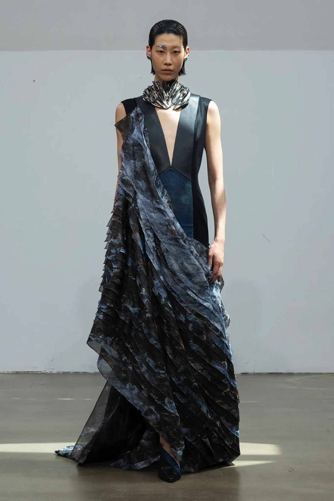 Rigid ceramic shells appear across shoulders, chests and faces, challenging conventional notions of couture embellishment. These are not accessories but armatures. At the same time, the collection features translucent layers, diagonal tailoring, and digitally rendered textiles that retain movement.