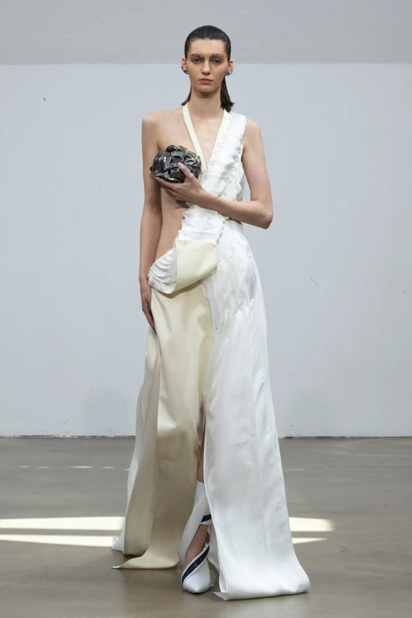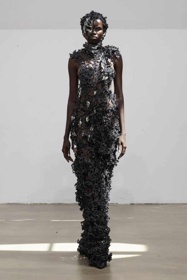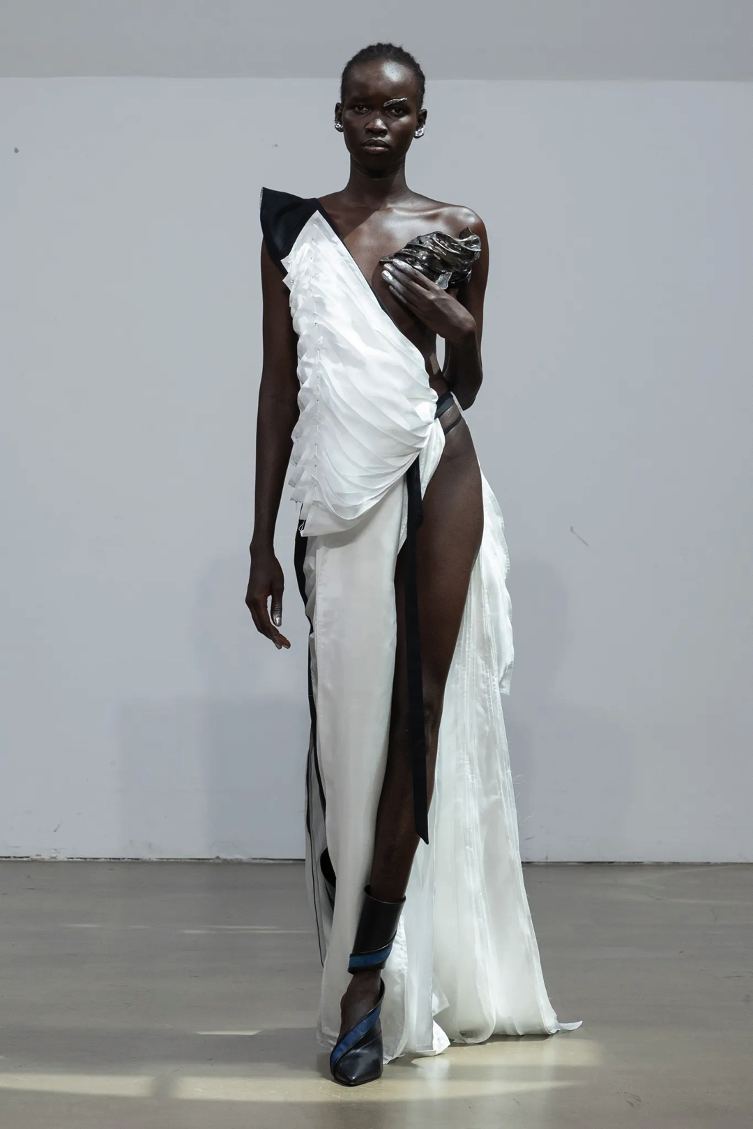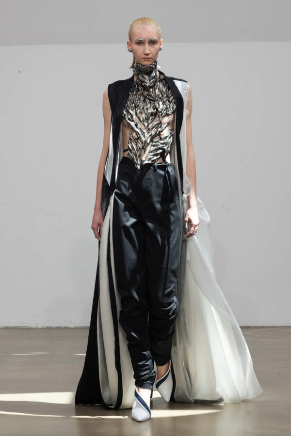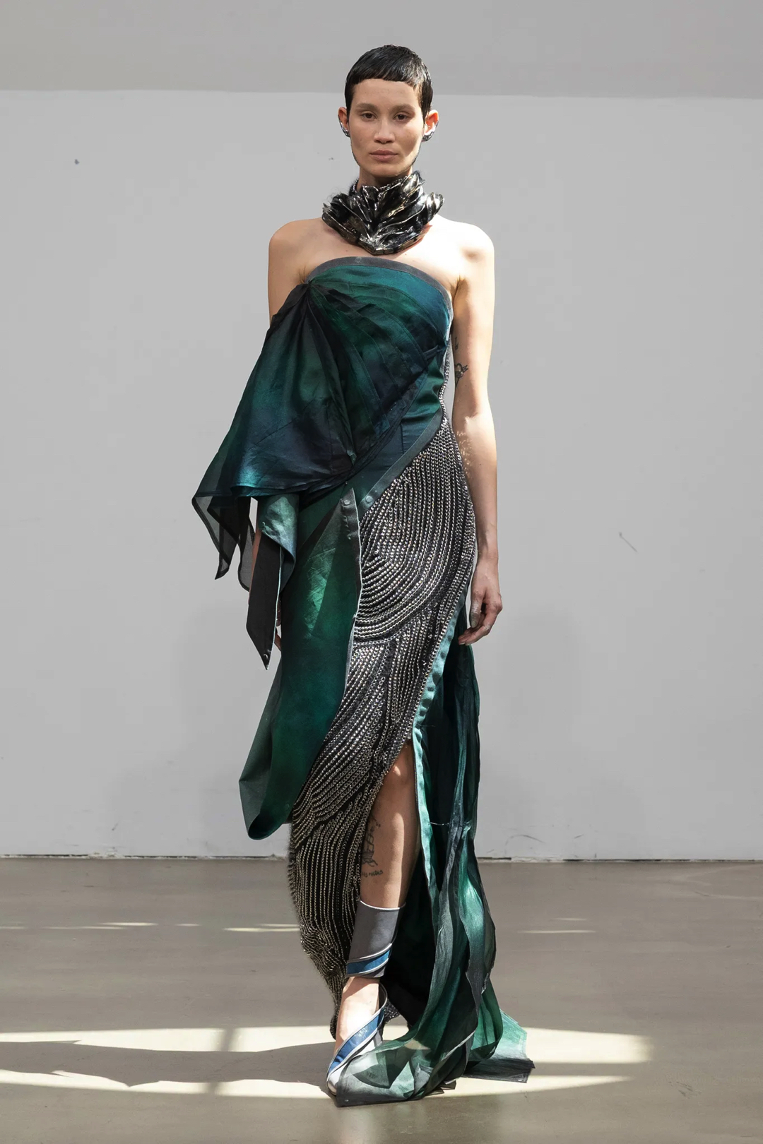 Rigid ceramic shells appear across shoulders, chests and faces, challenging conventional notions of couture embellishment. These are not accessories but armatures. At the same time, the collection features translucent layers, diagonal tailoring, and digitally rendered textiles that retain movement.