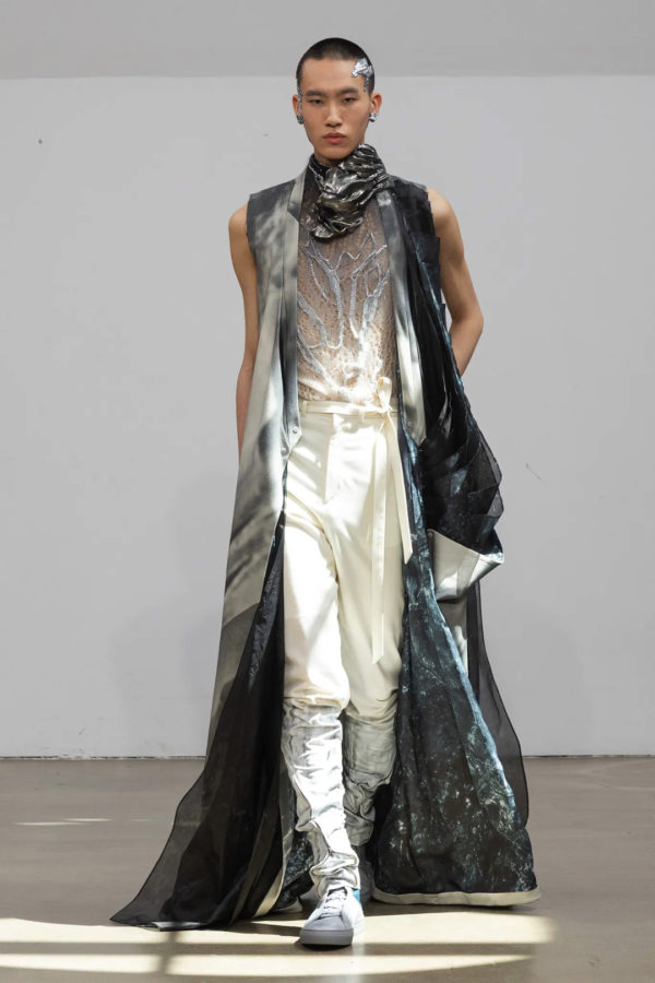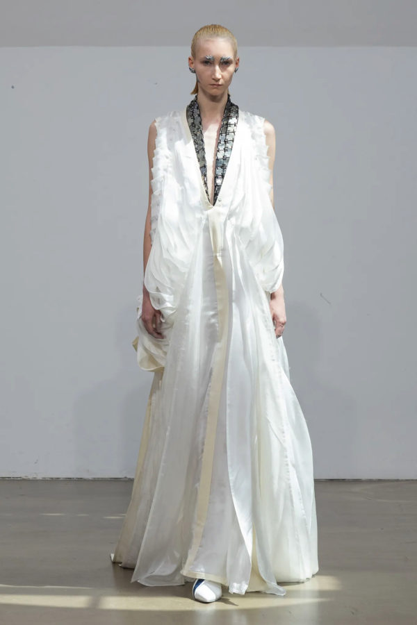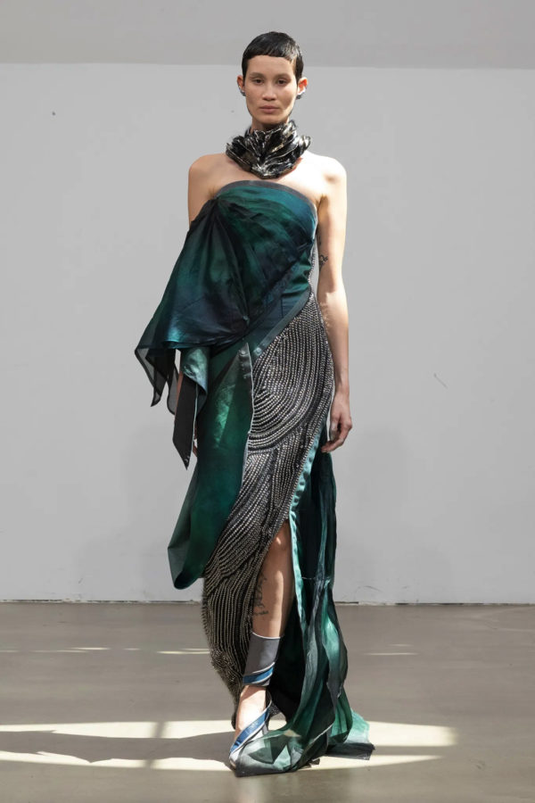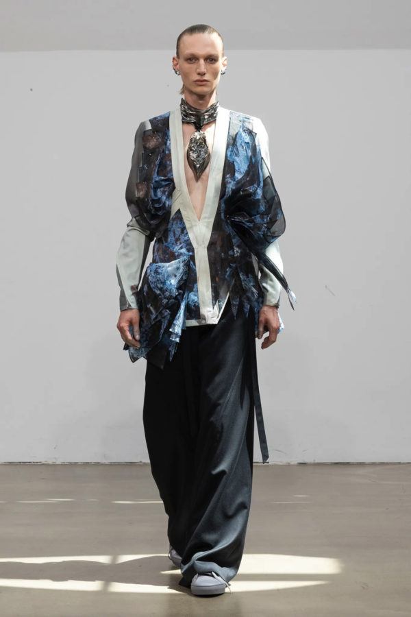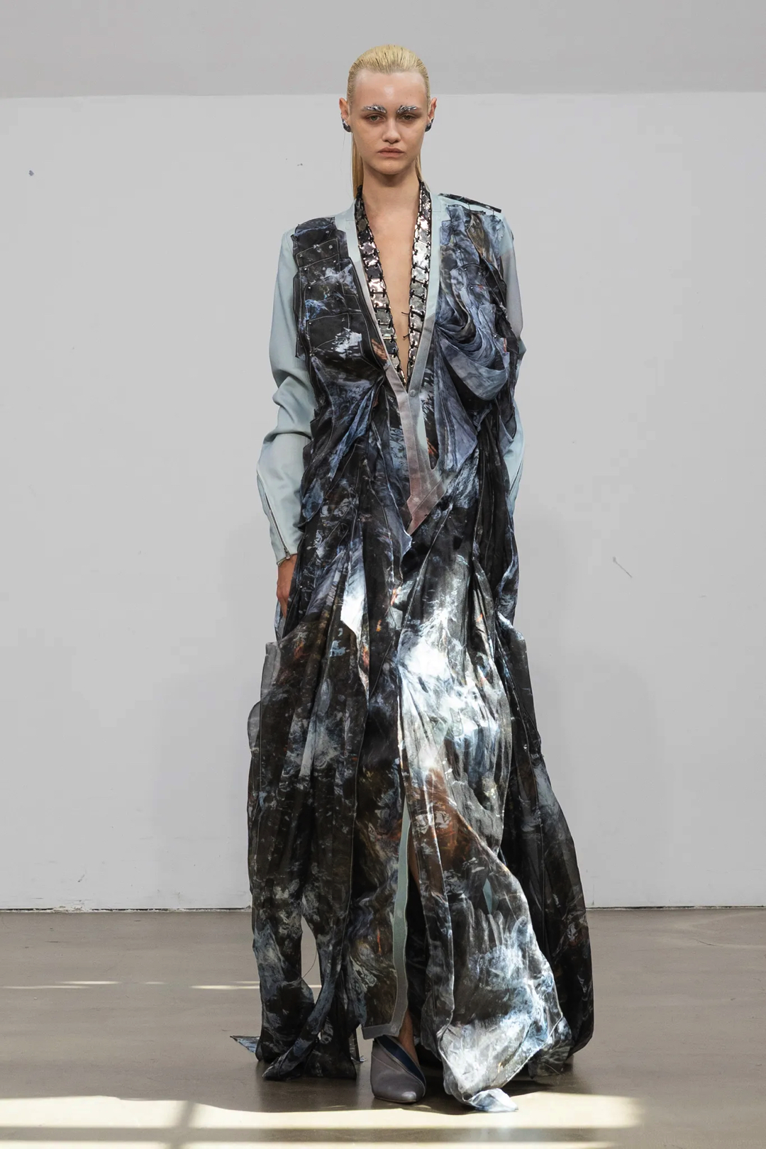 Material innovation remains central to Nakazato’s process. Metal chain was crocheted with mohair, creating surfaces that read both soft and sharp. Lightweight wire structures lent volume to sheer garments, while other pieces used digitally printed fabrics that shifted with light, referencing ice formations and aquatic topographies. The color palette stayed close to the source material: whites, greys, pale blues and iridescent green, occasionally interrupted by the sheen of ceramic or the shimmer of synthetic threads.